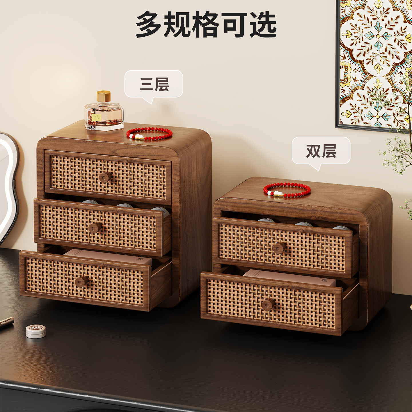 实木桌面收纳盒化妆品梳妆台首饰展示架台面收纳柜置物化妆桌藤编