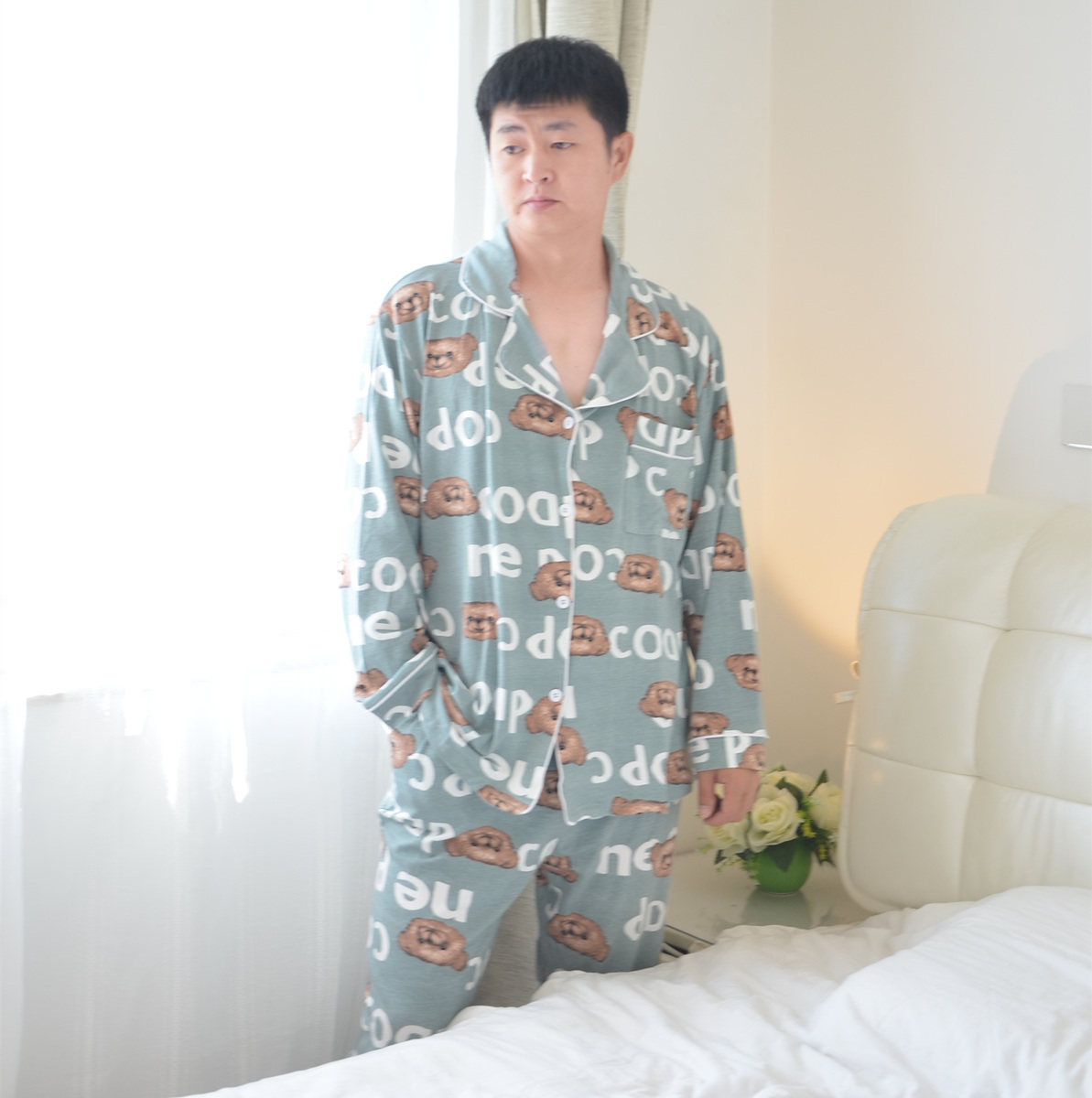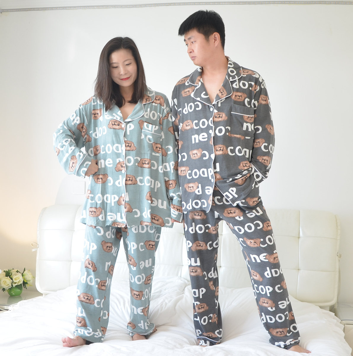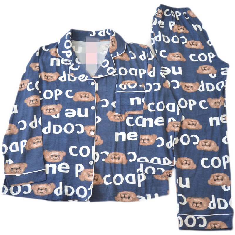 200斤加肥大码字母熊睡衣女春秋情侣纯棉长袖裤男士衬衫款家居服
