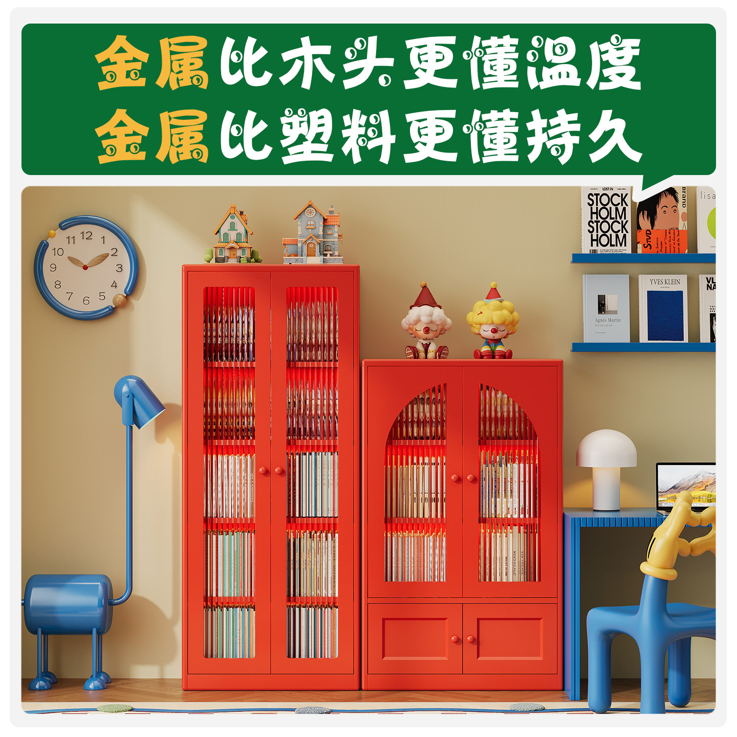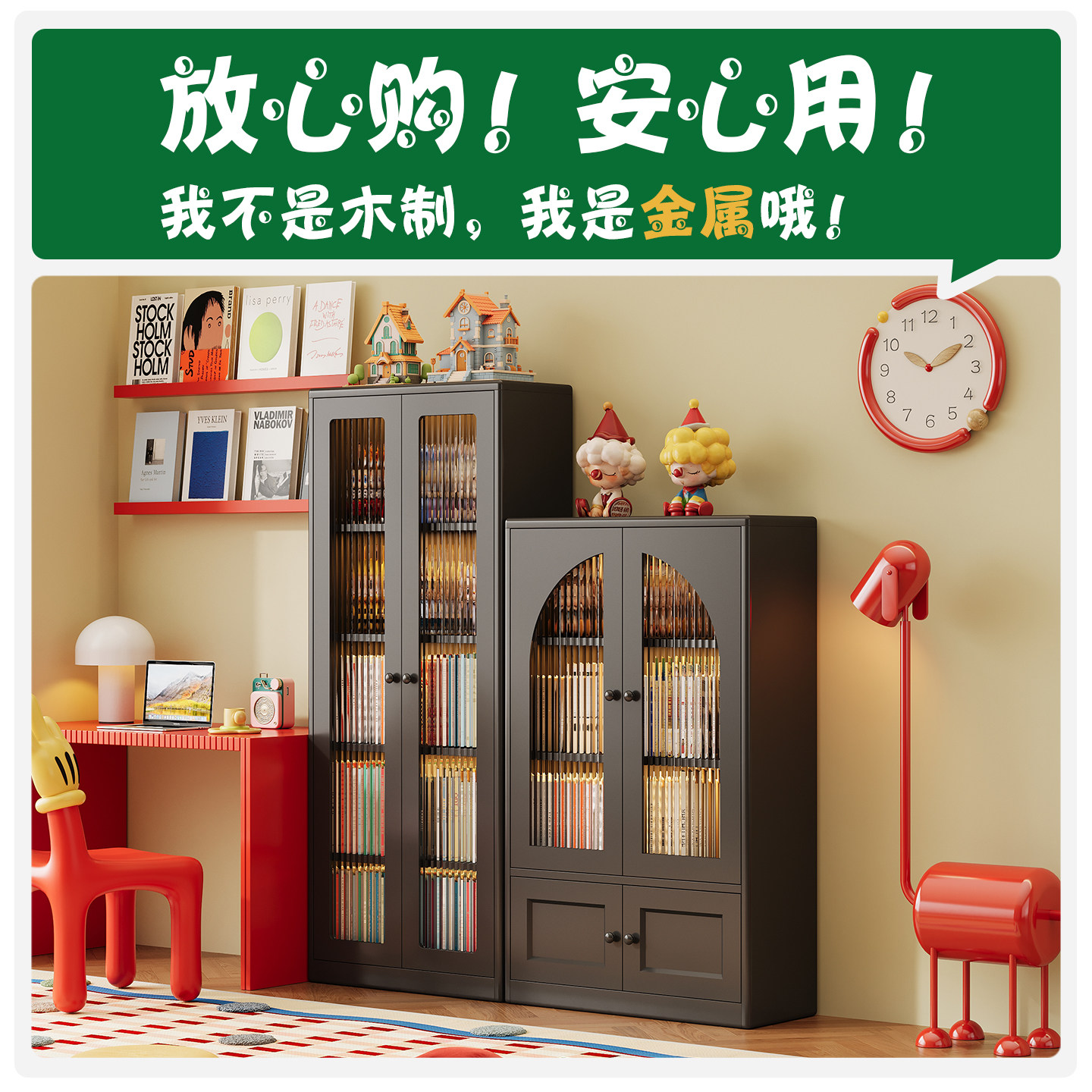 书架落地置物架铁皮展示柜家用客厅儿童防尘书柜铁艺柜子储物柜