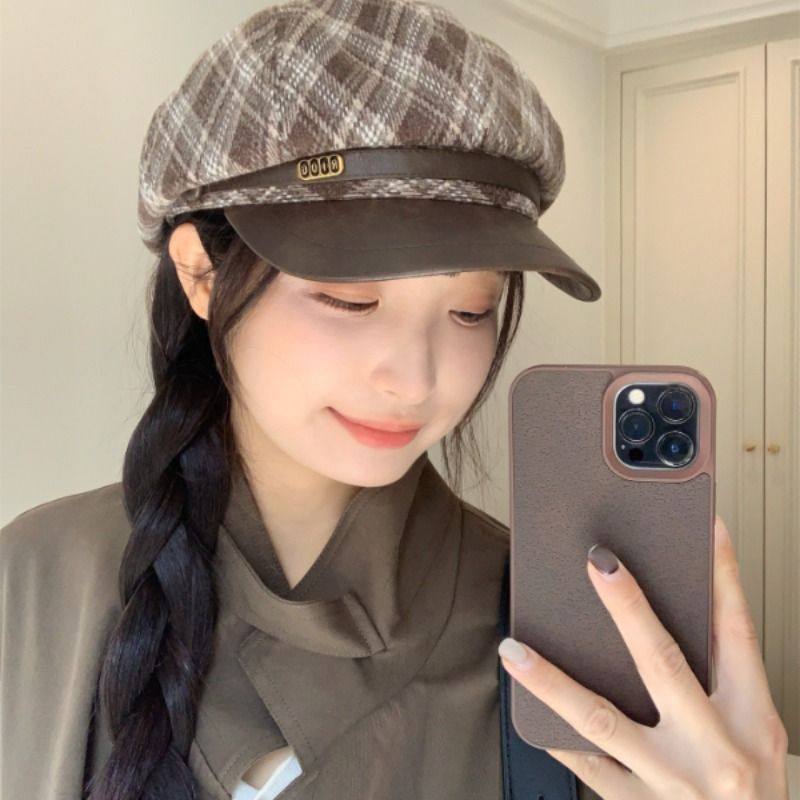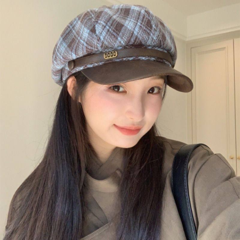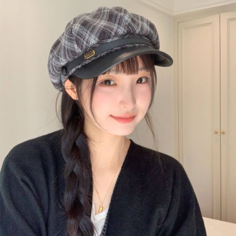 显脸小英伦风格纹毛呢八角帽黑复古反戴贝雷帽女画家艺术报童帽子