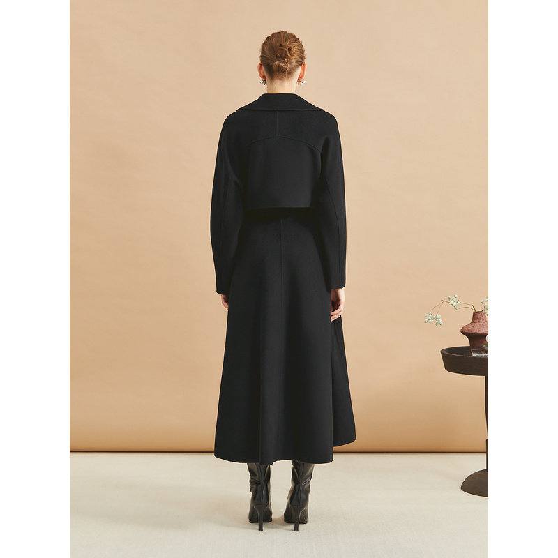 COCOBELLA设计感假两件大翻领毛呢外套女秋冬新款黑色大衣WL0002