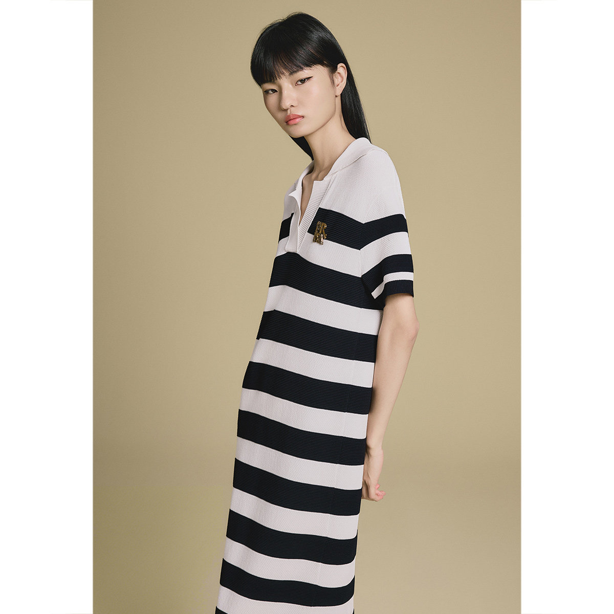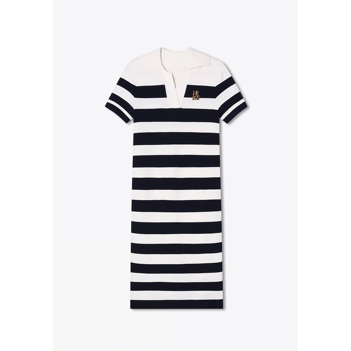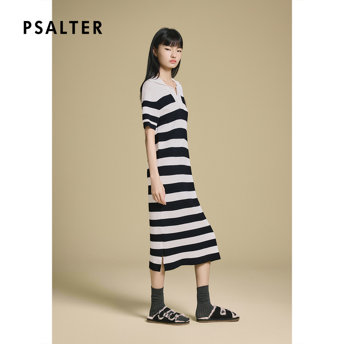 PSALTER诗篇条纹黑白撞色半开胸V领针织连衣裙2025秋款