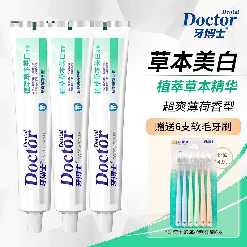 牙博士草本美白牙膏植萃精华去渍护龈清火洁齿大容量薄荷不含氟