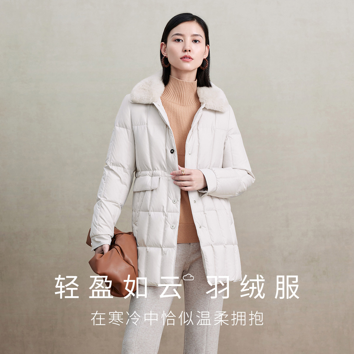 菲妮迪品牌90白鹅绒羽绒服女2025冬季新款收腰保暖毛领中长款外套