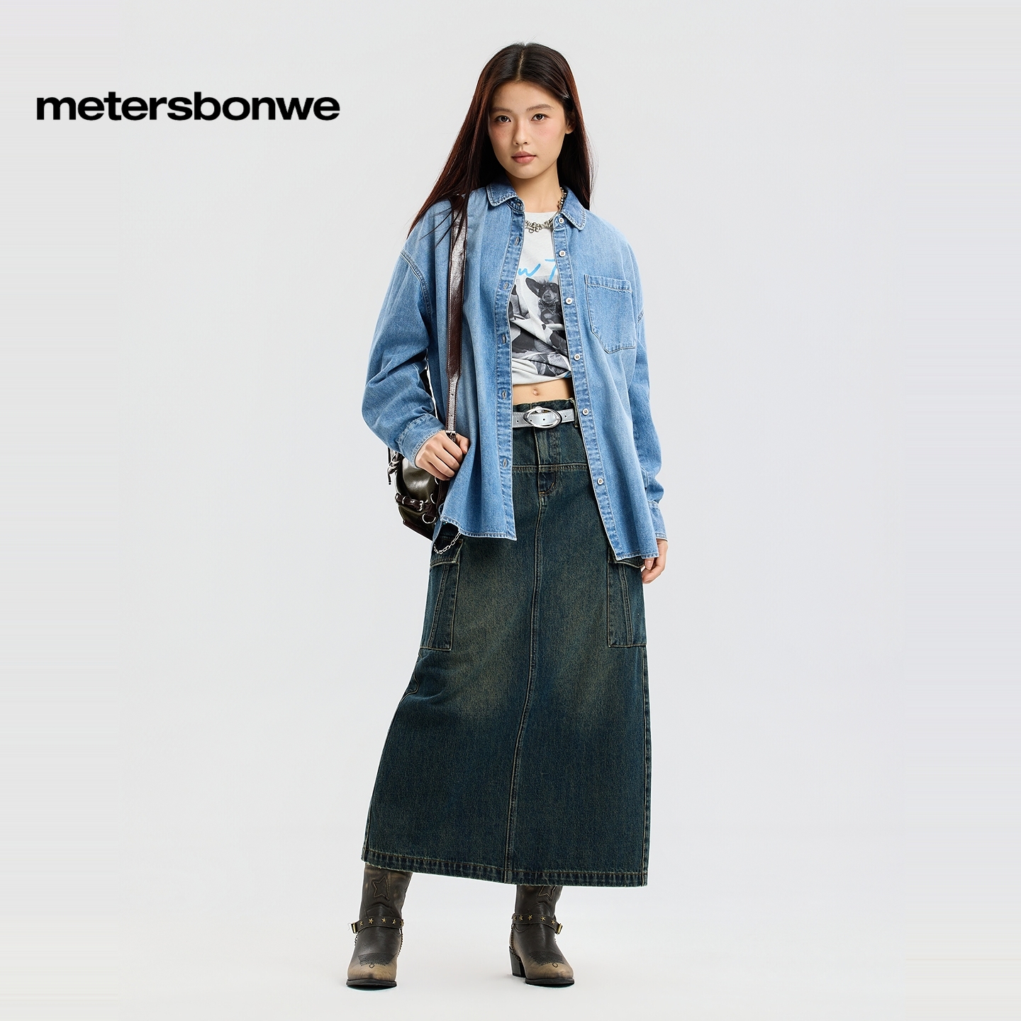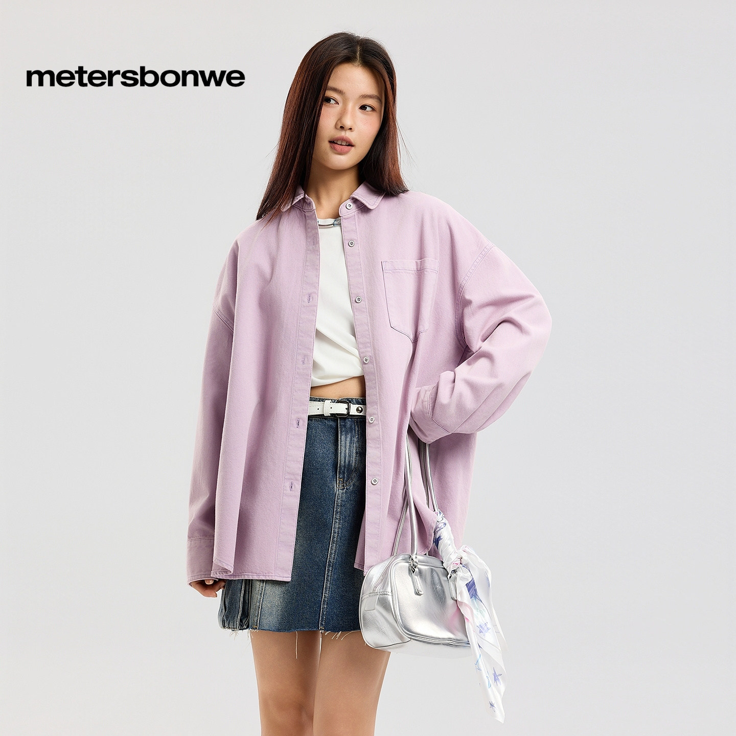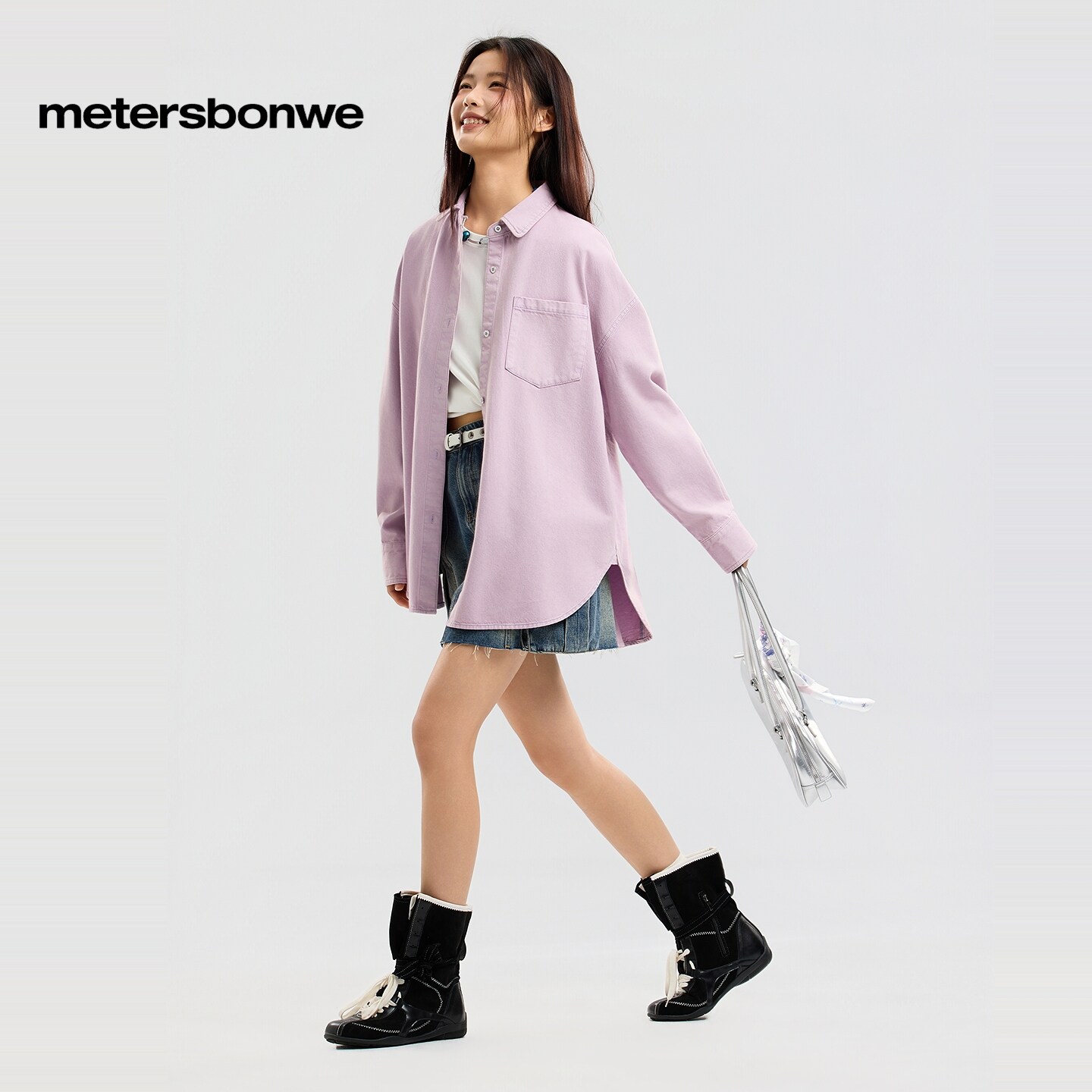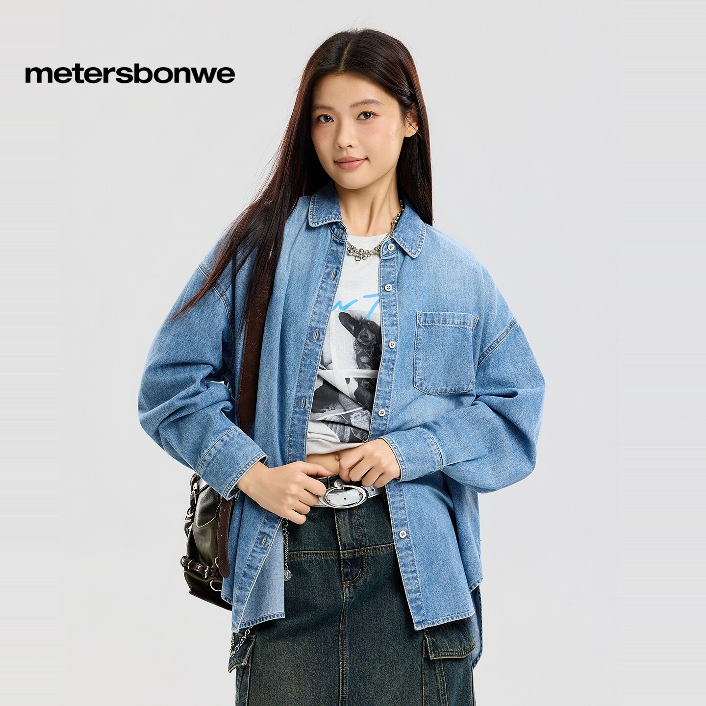 美特斯邦威衬衫女2026春季新款复古做旧水洗纯色翻领纯棉牛仔外套