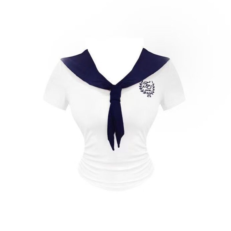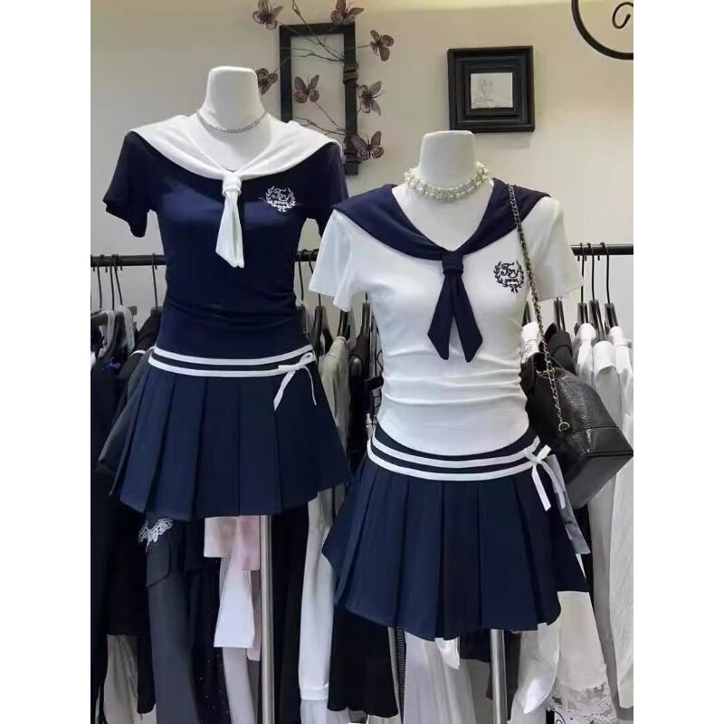 纯欲风大码显瘦t恤套装女夏季撞色百褶半身裙减龄海军领短袖上衣
