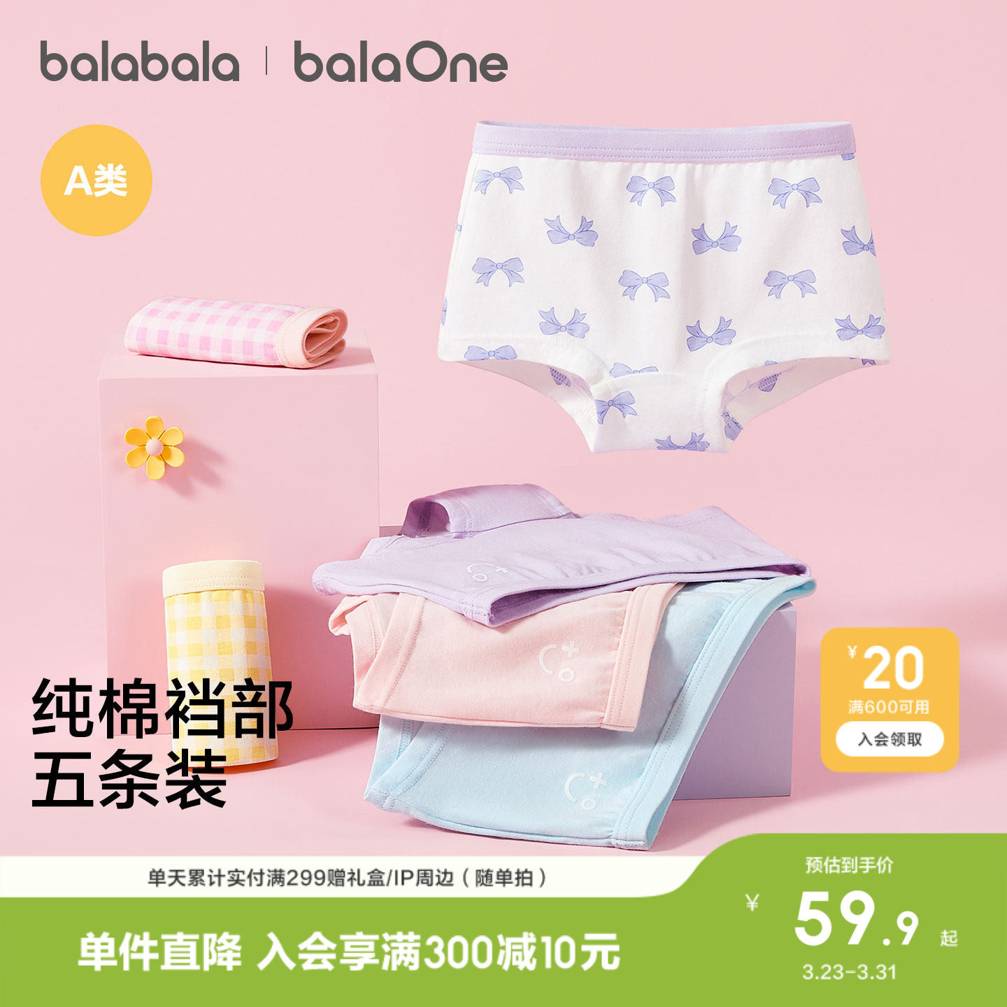 巴拉巴拉儿童内裤棉a类女童平角短裤小童中大童宝宝四角裤五条装
