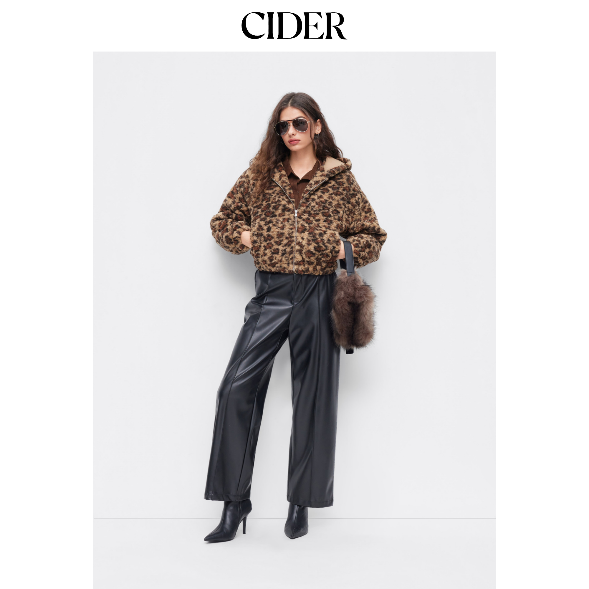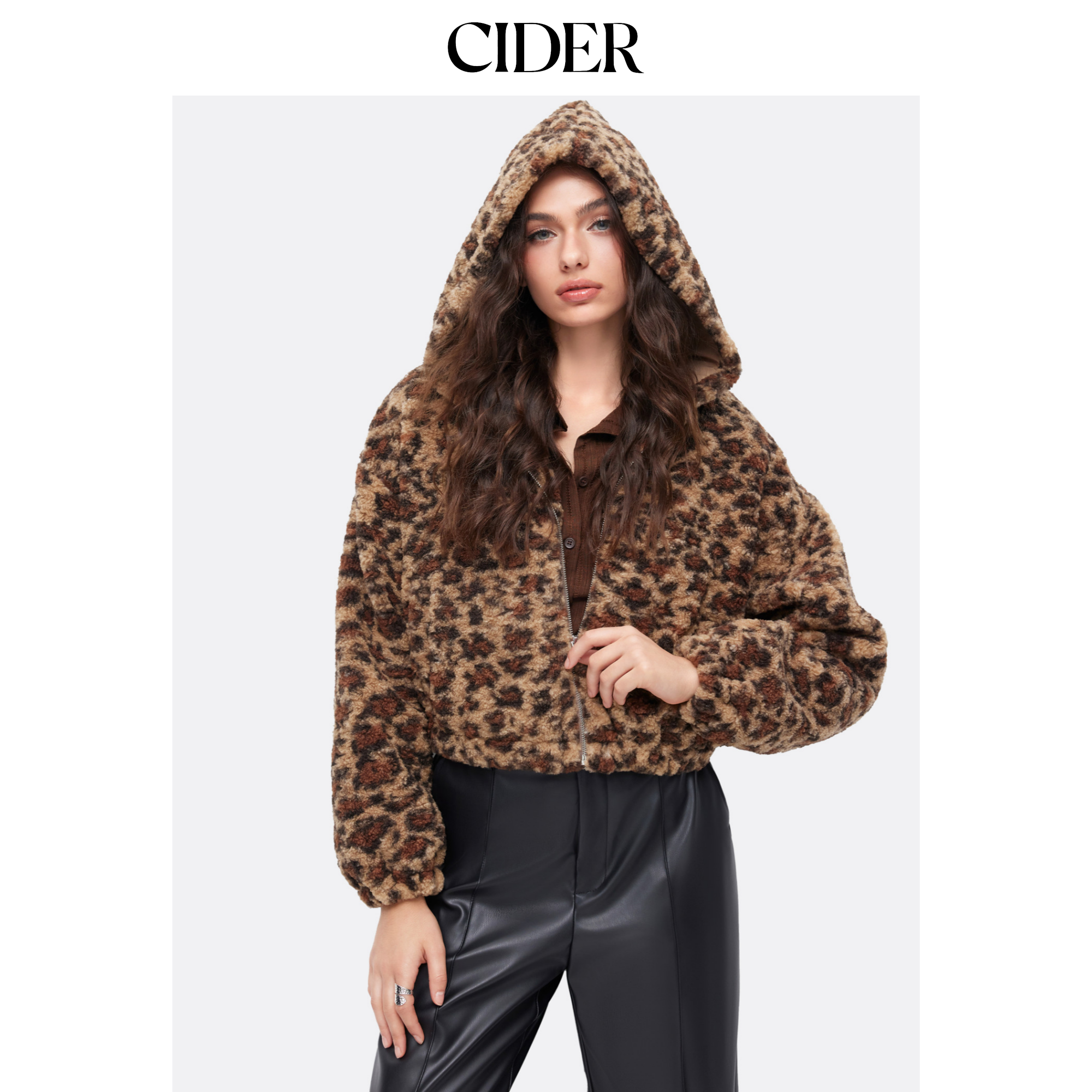 CIDER短款豹纹拉链摇粒绒连帽夹克115050008