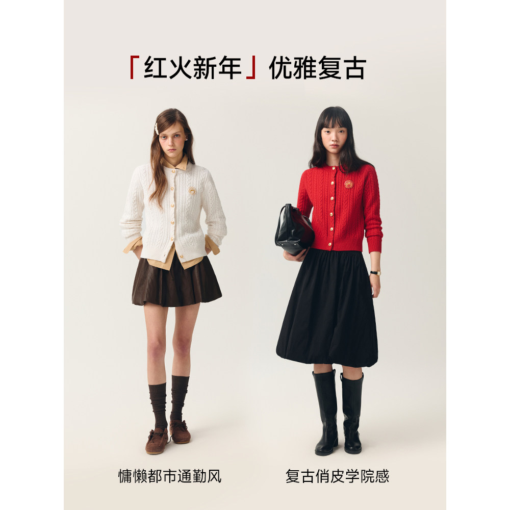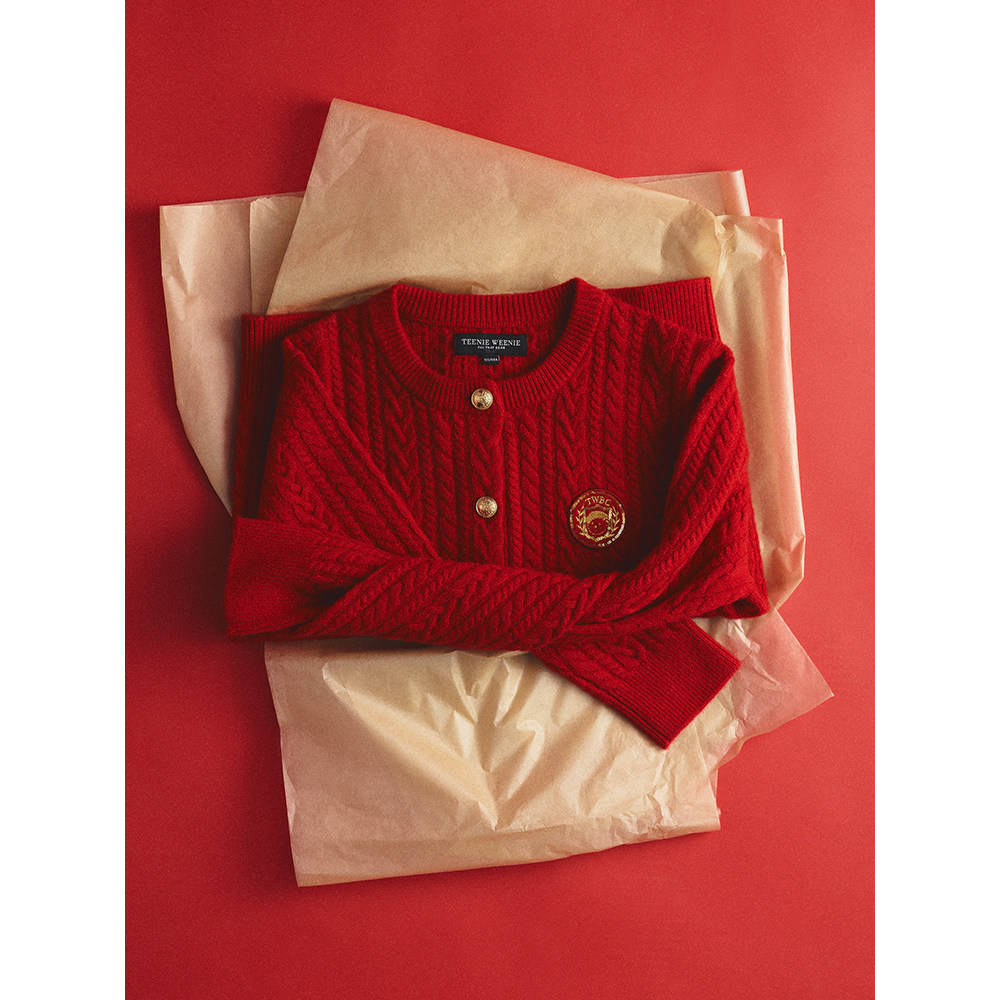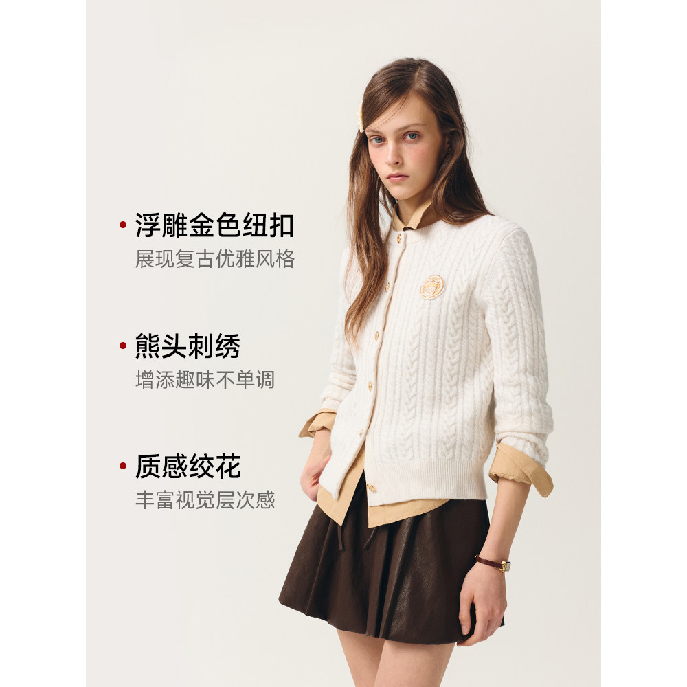 TeenieWeenie小熊女装毛针织衫26春新款复古优雅绞花金扣圆领开衫