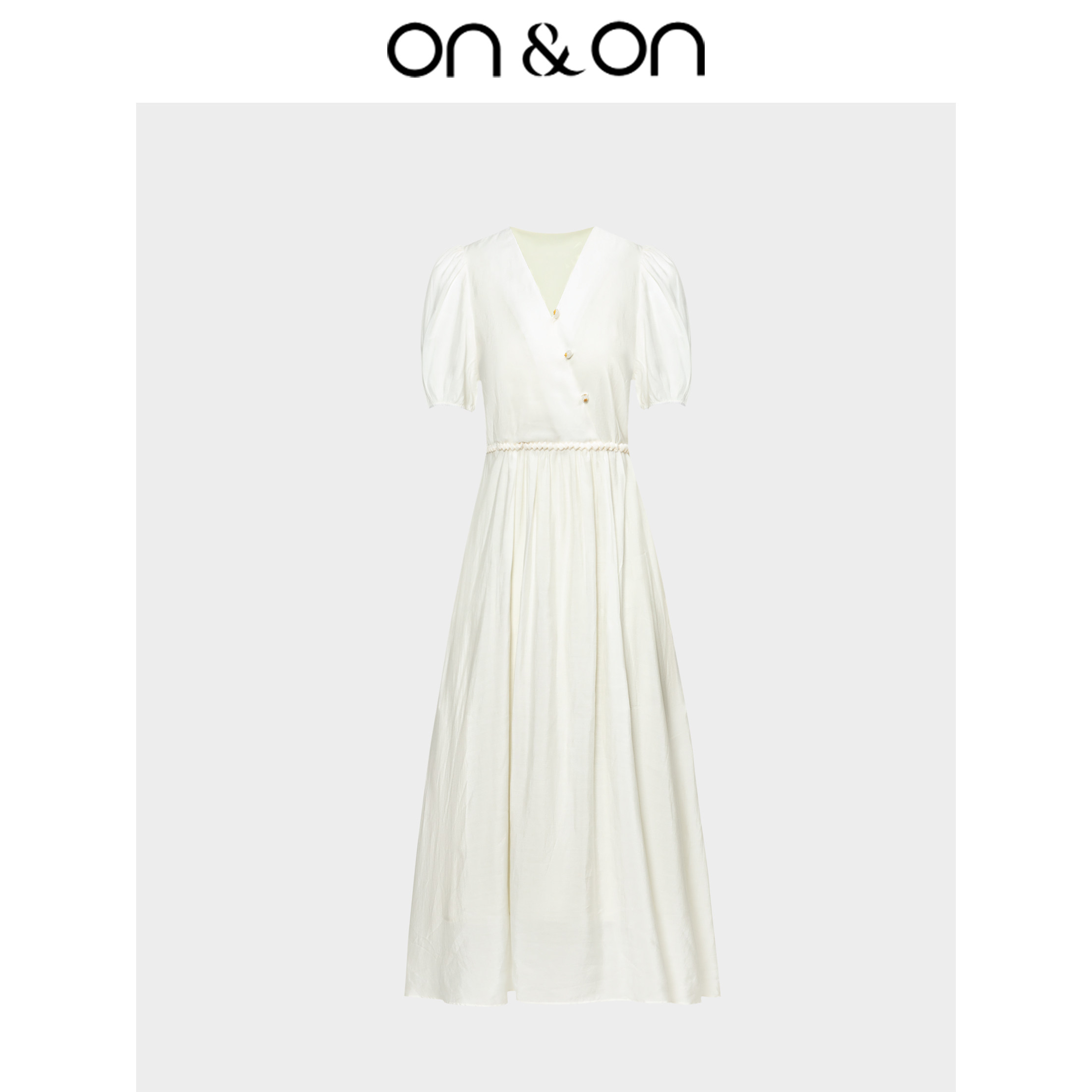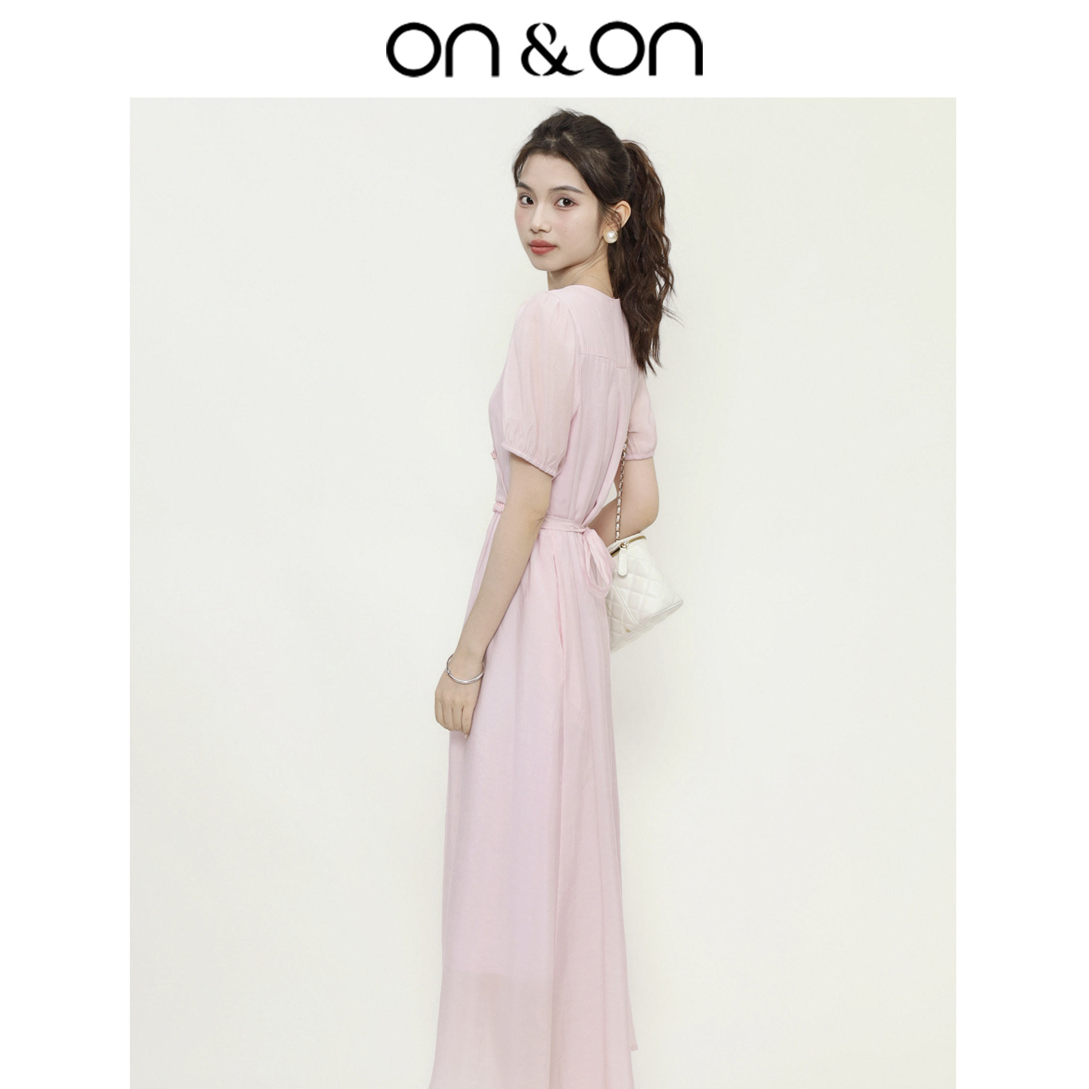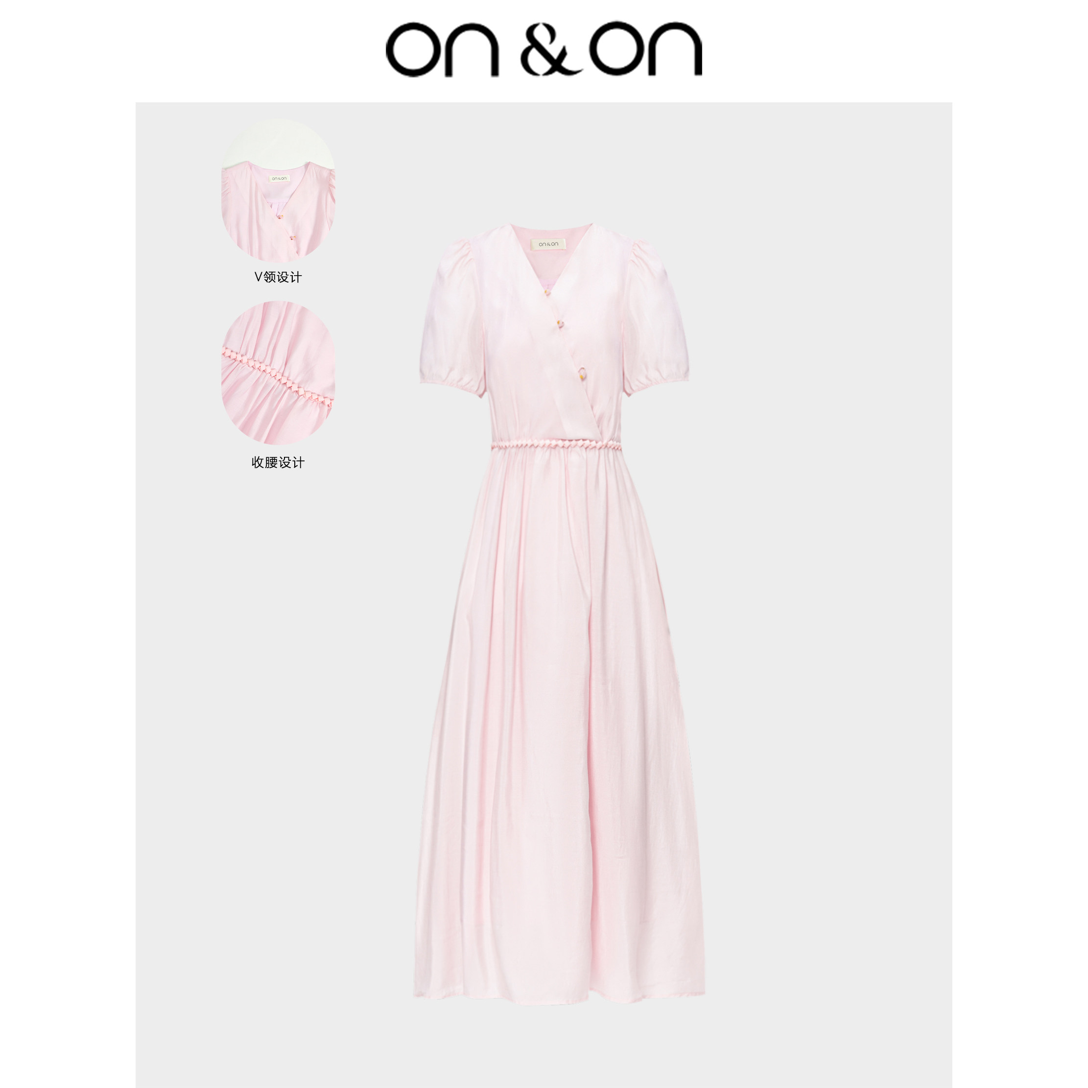 ON&ON/安乃安优雅气质高级感V领珍珠扣系带收腰修身粉色连衣裙女