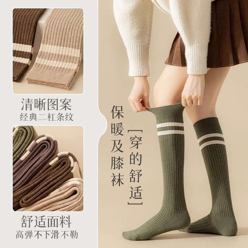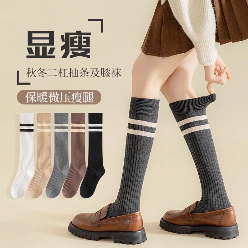 条纹小腿袜子女款秋冬压力显瘦灰色及膝袜加厚保暖防风防滑长筒袜