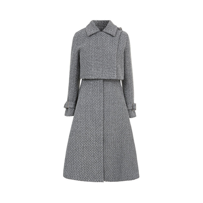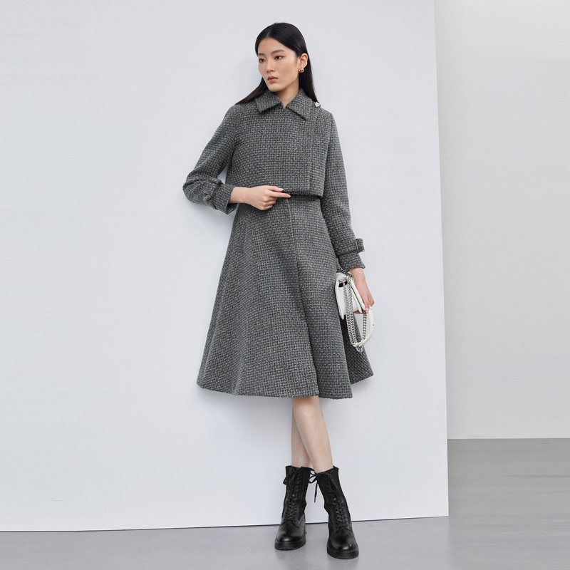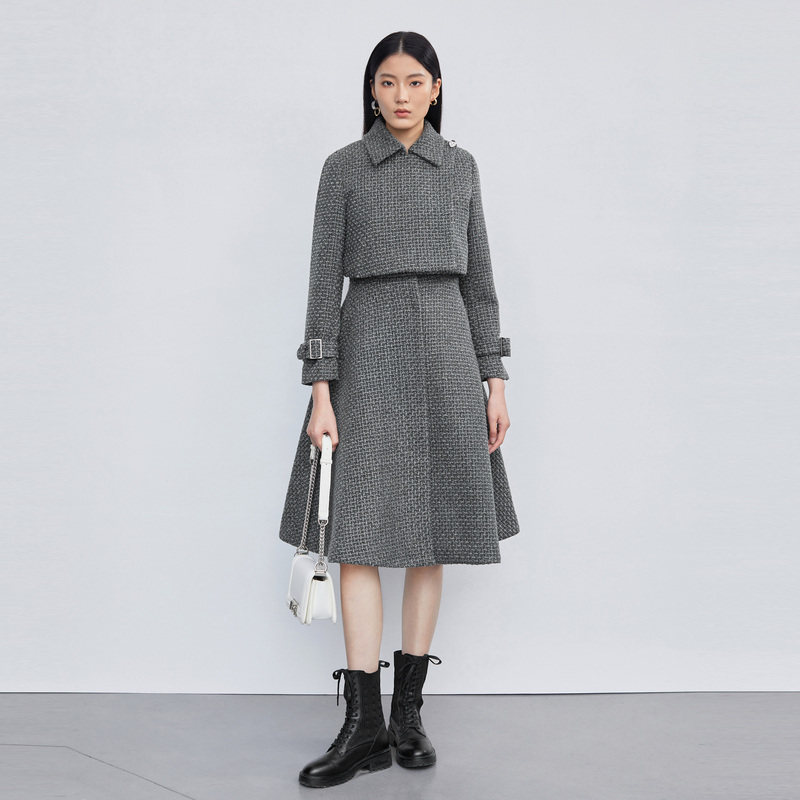 sdeer圣迪奥女装小香风翻领肌理毛呢连衣裙套装S224Z1410