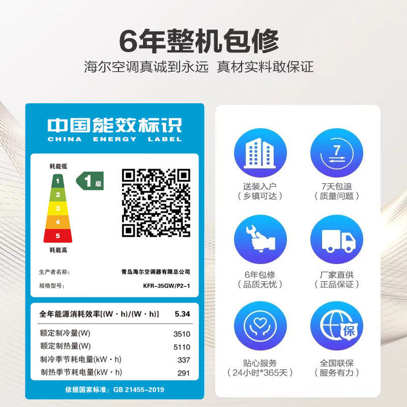 海尔空调净省电P2一级变频1.5匹家用正品卧室冷暖挂机旗舰店