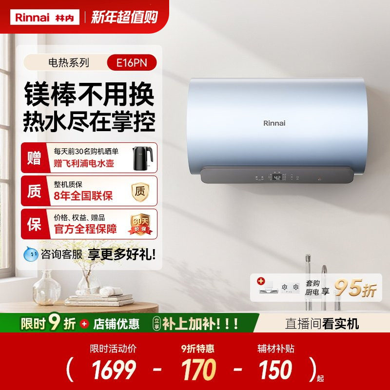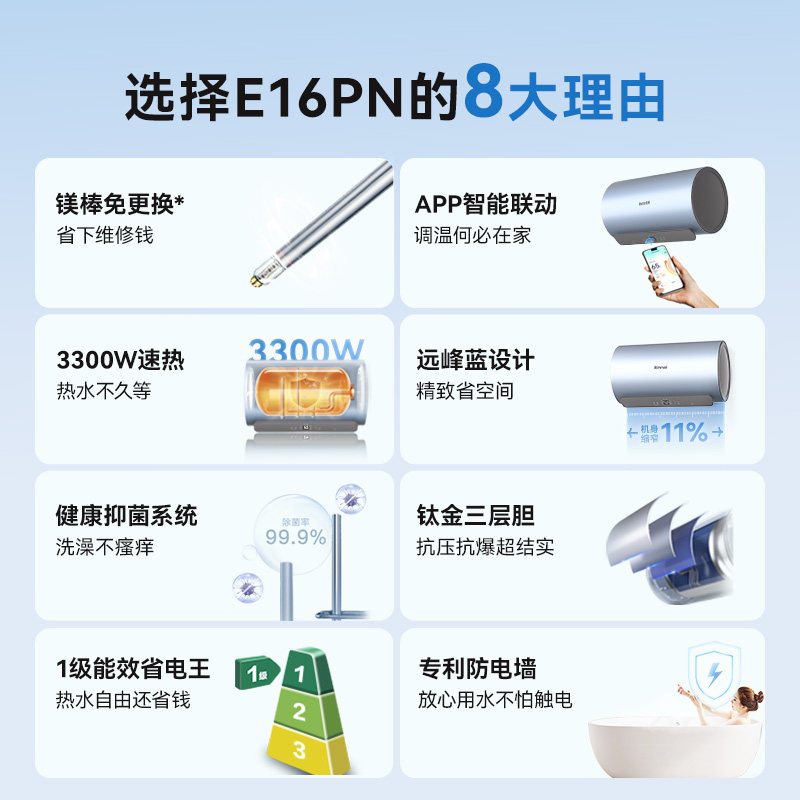 [新品电热]林内电热水器家用速热智能储水式免换镁棒60升E16PN