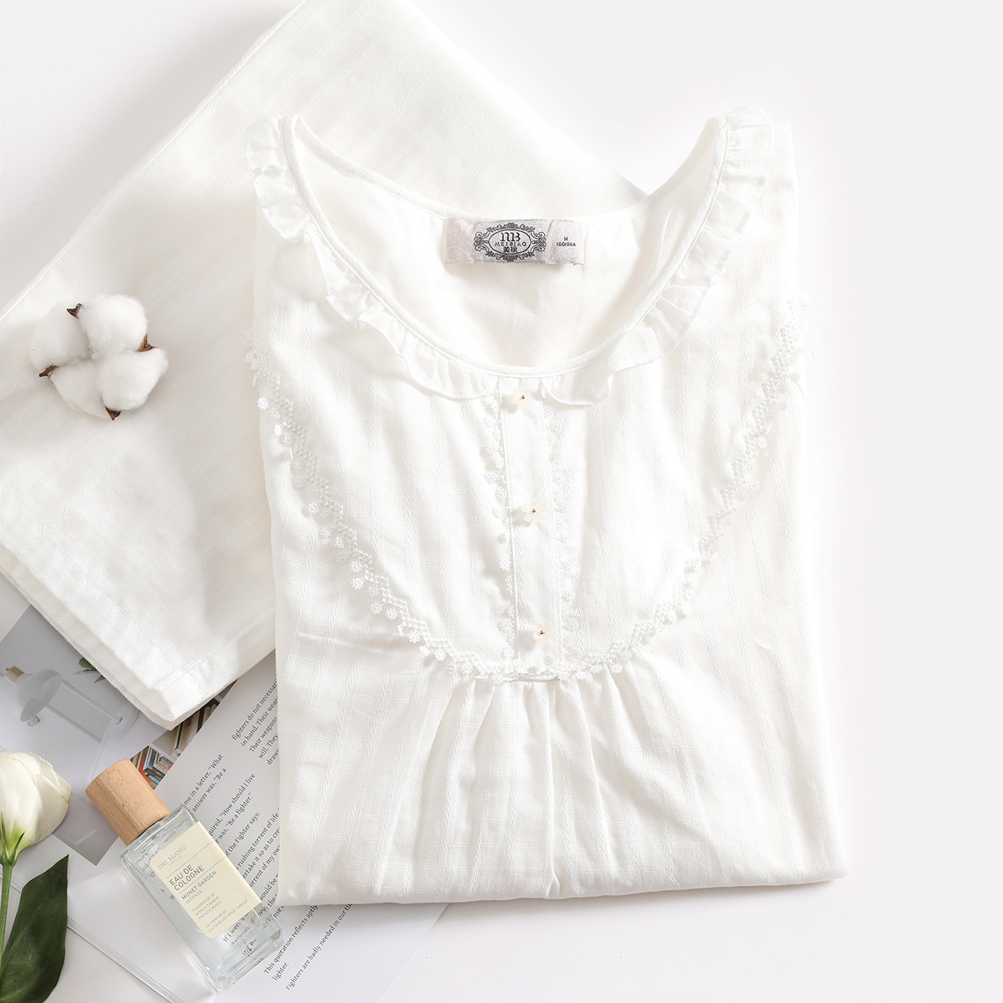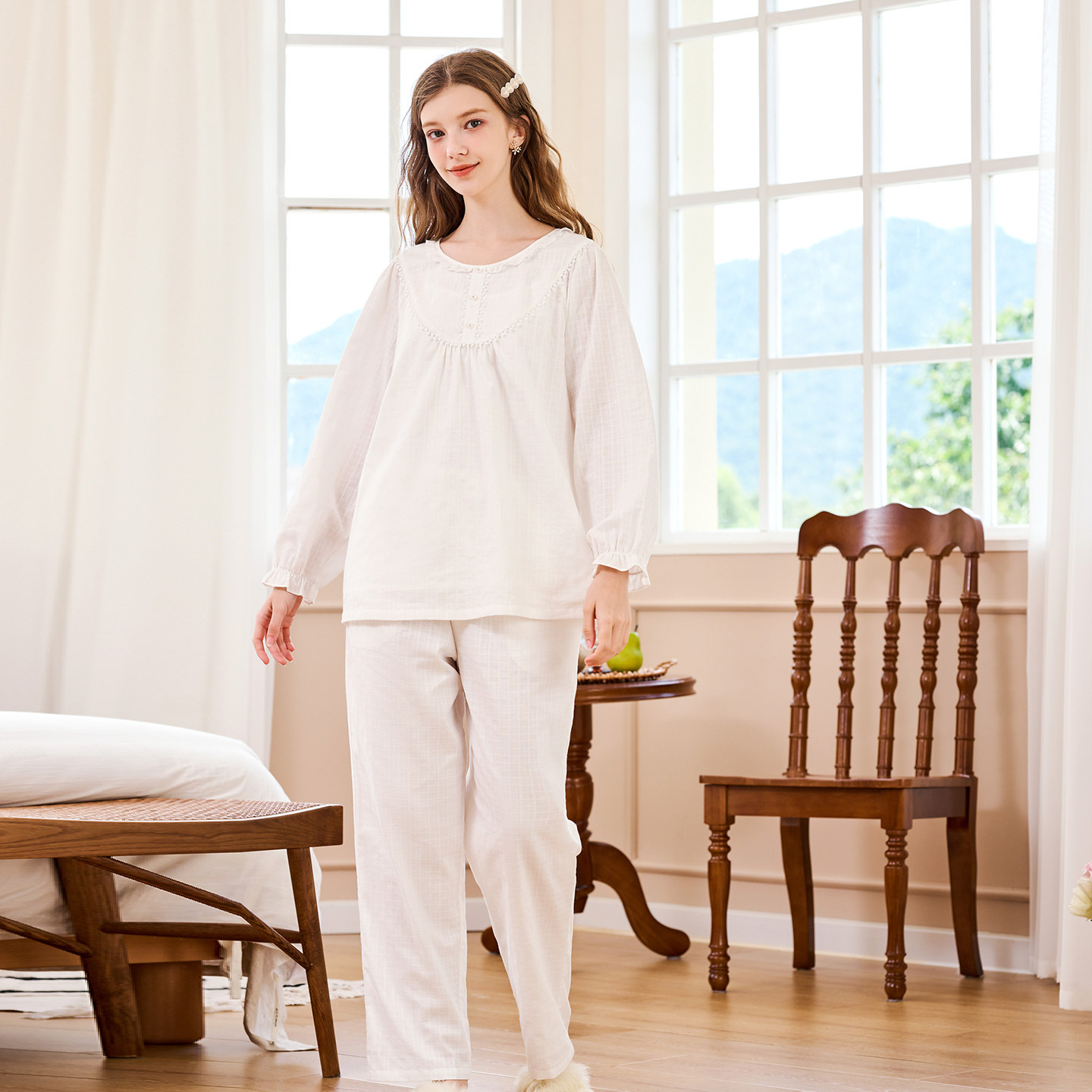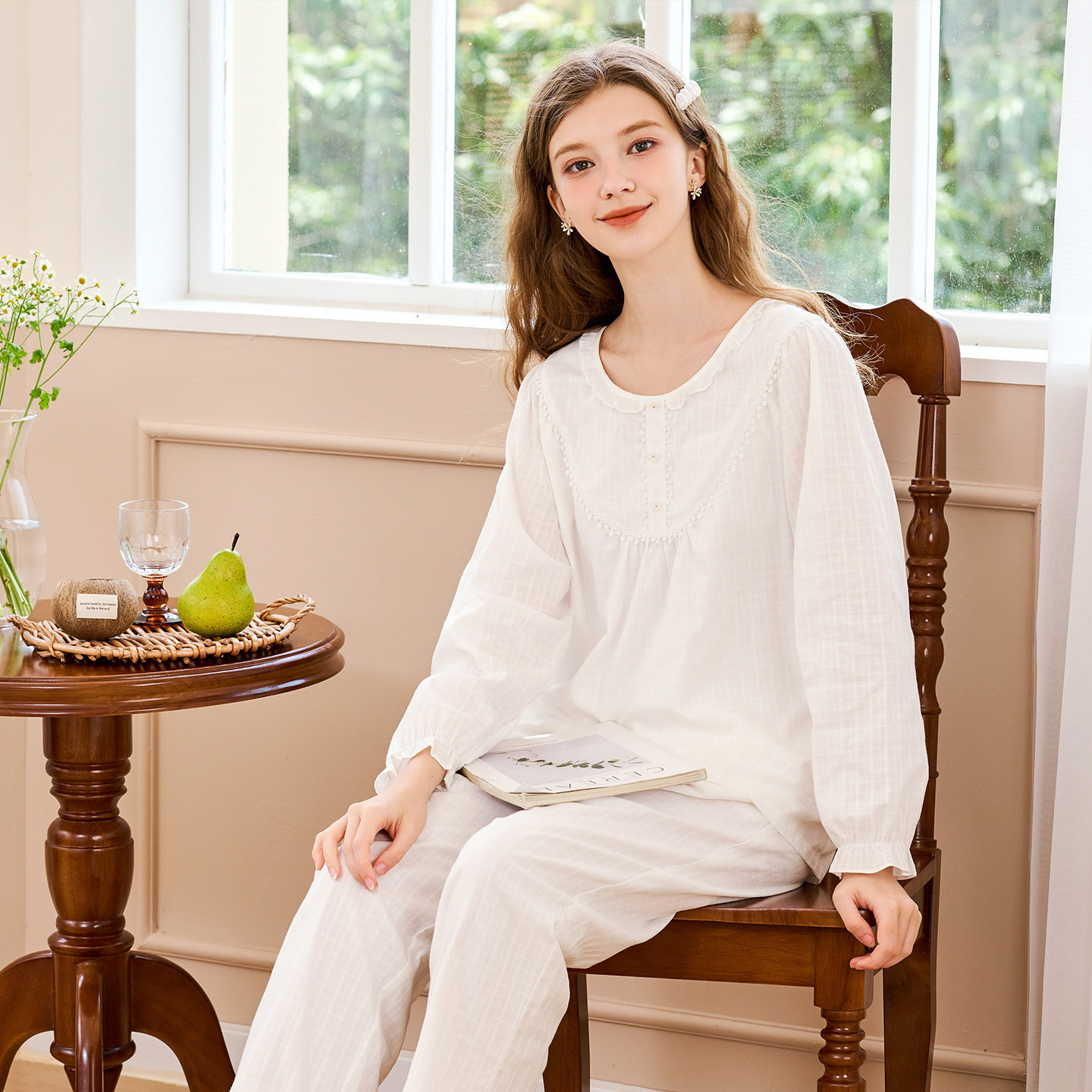 美标新款长袖纯棉睡衣套装女春秋提花复古甜美宫廷风全棉家居服夏
