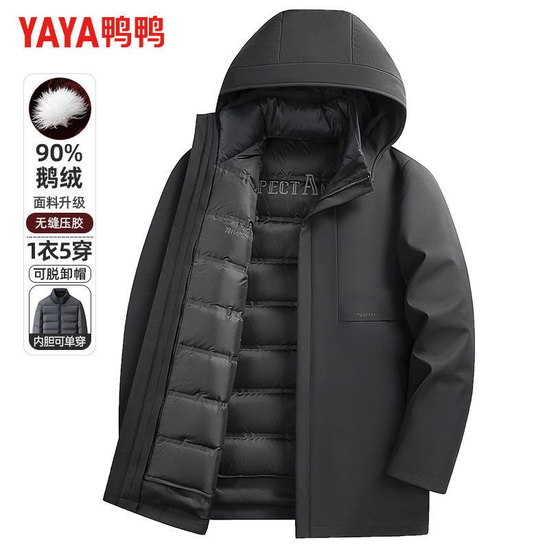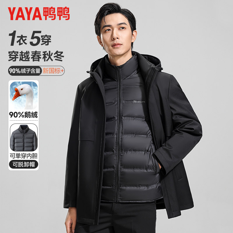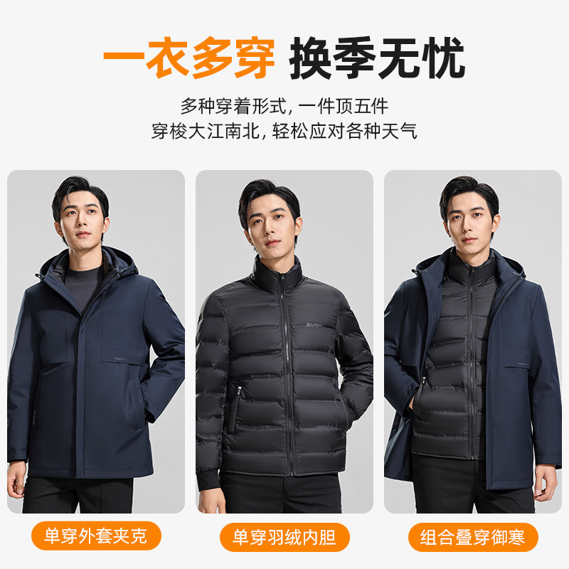 【鹅绒+一衣五穿】鸭鸭可拆卸内胆羽绒服男中长款商务连帽爸爸装