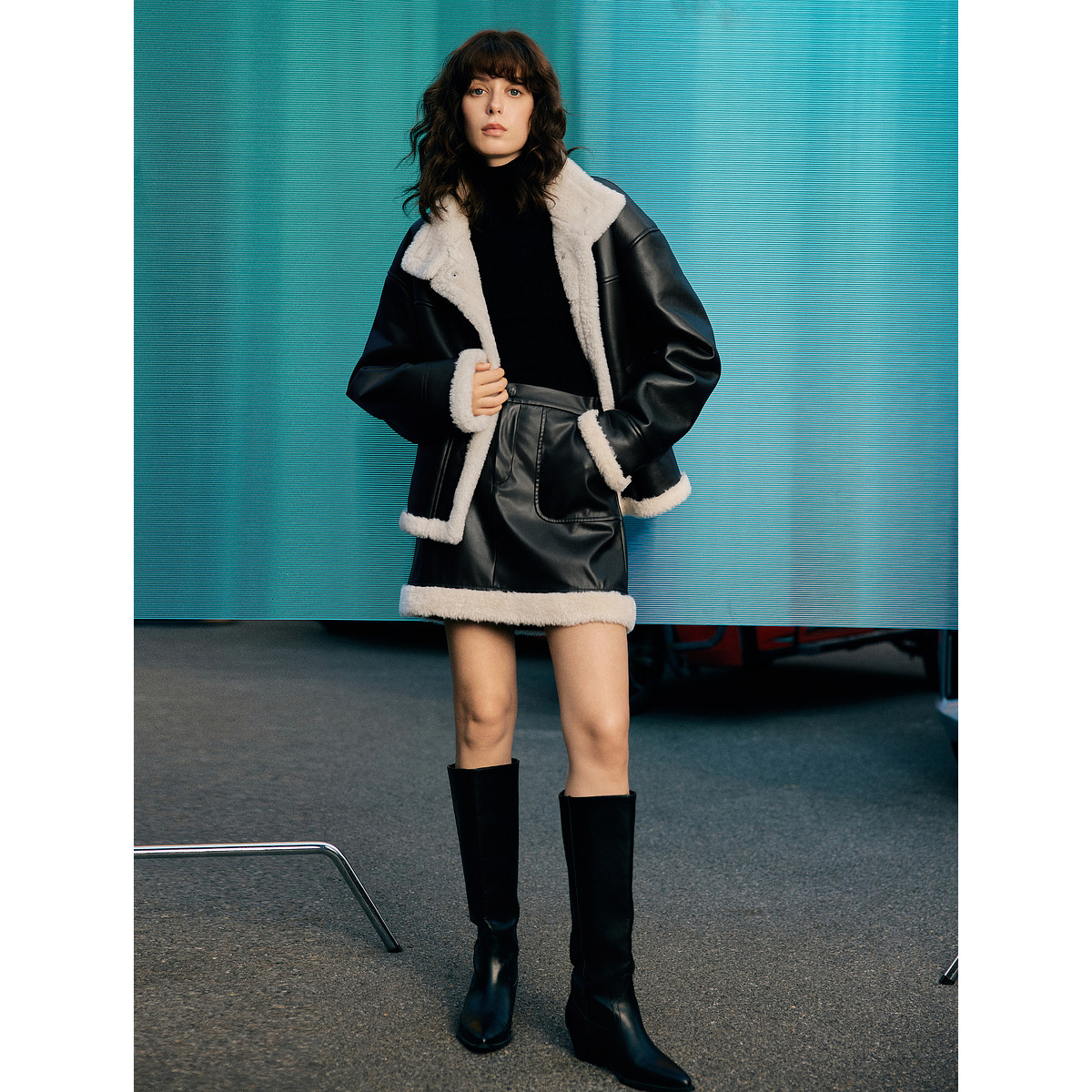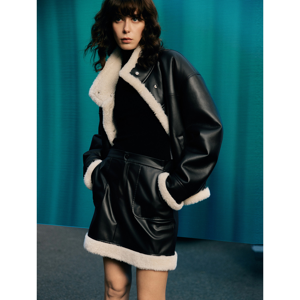 ELLE黑色皮毛一体高腰A字半身裙女2025冬新款小个子气质显瘦短裙