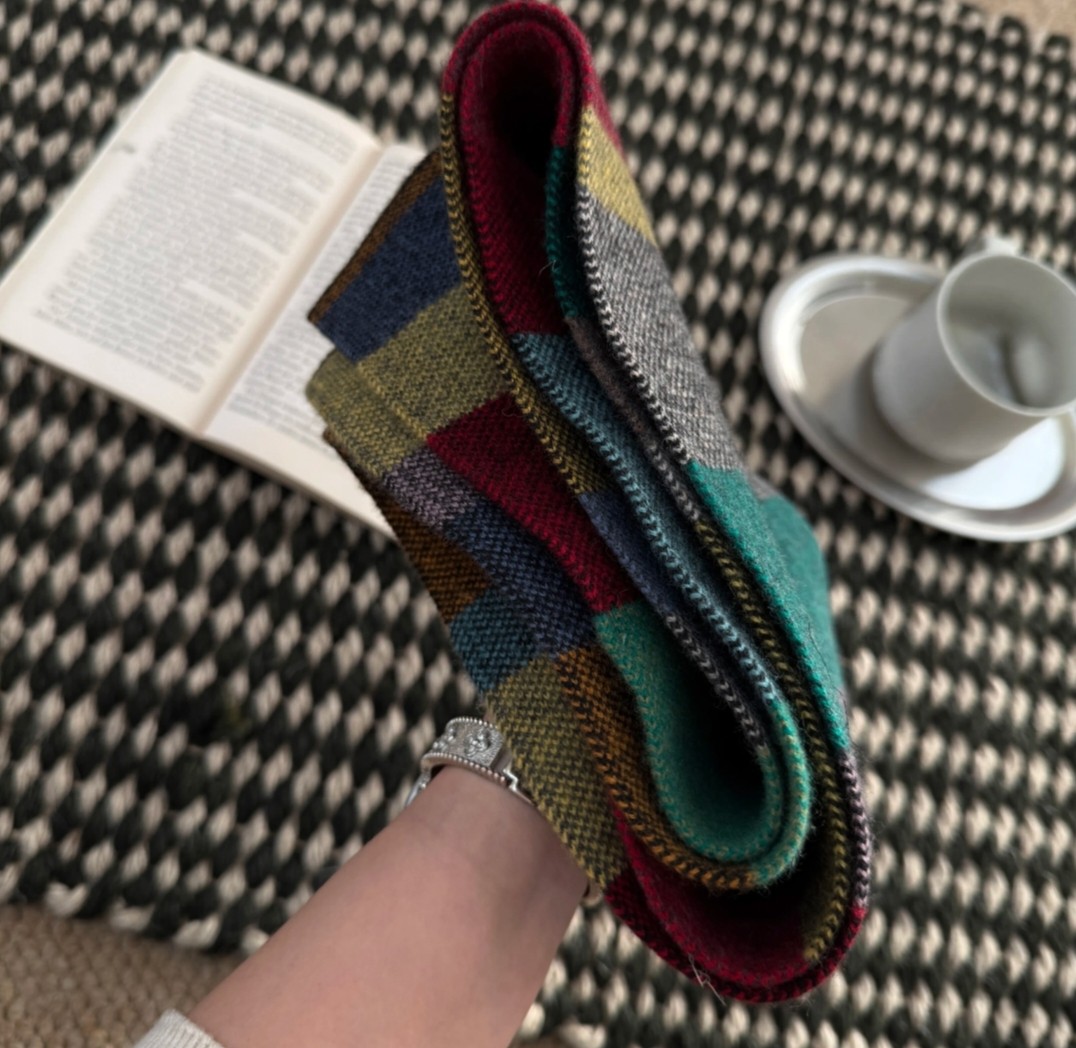 彩虹方糖色100%纯羊毛针织围巾女秋冬季新款保暖护颈条纹围脖轻奢