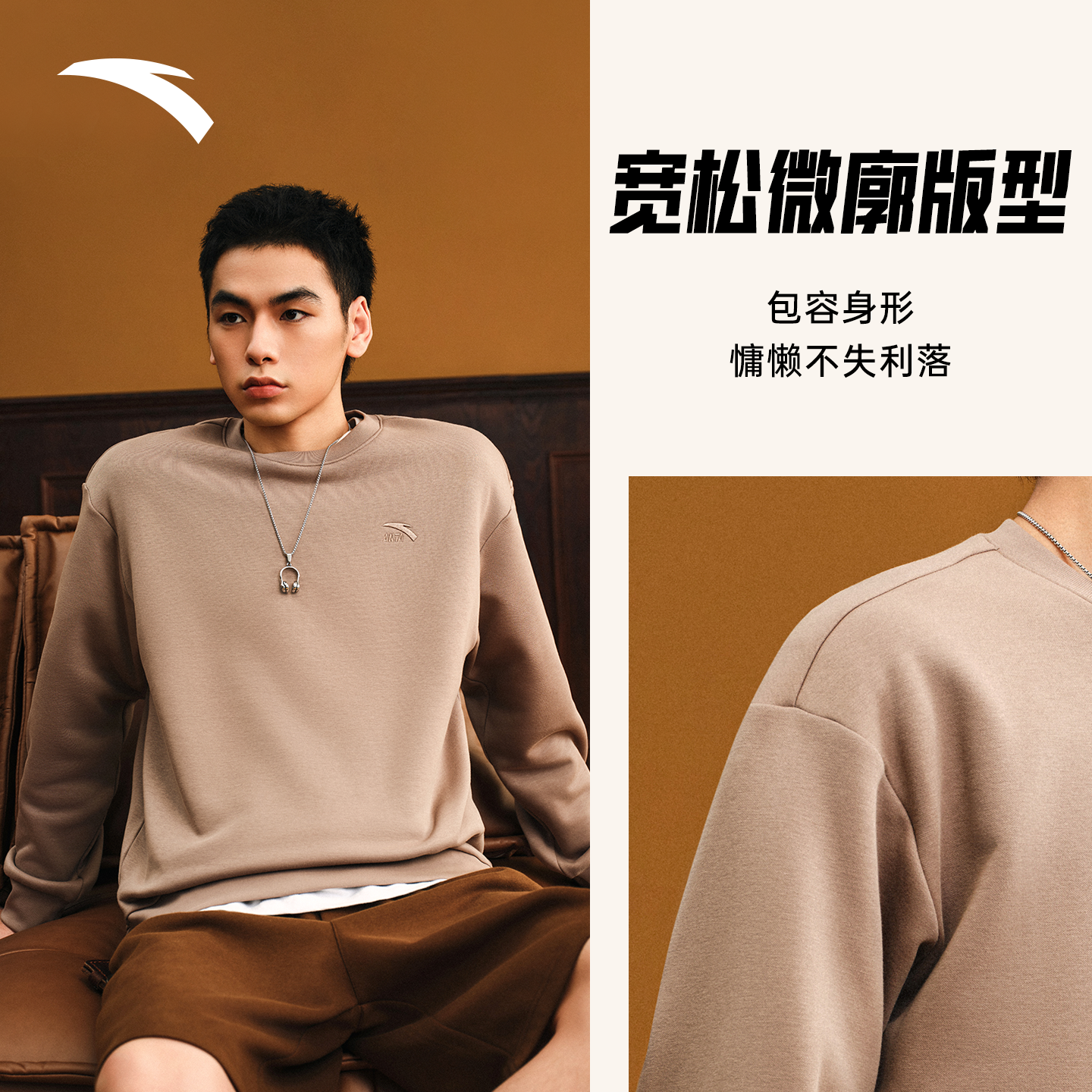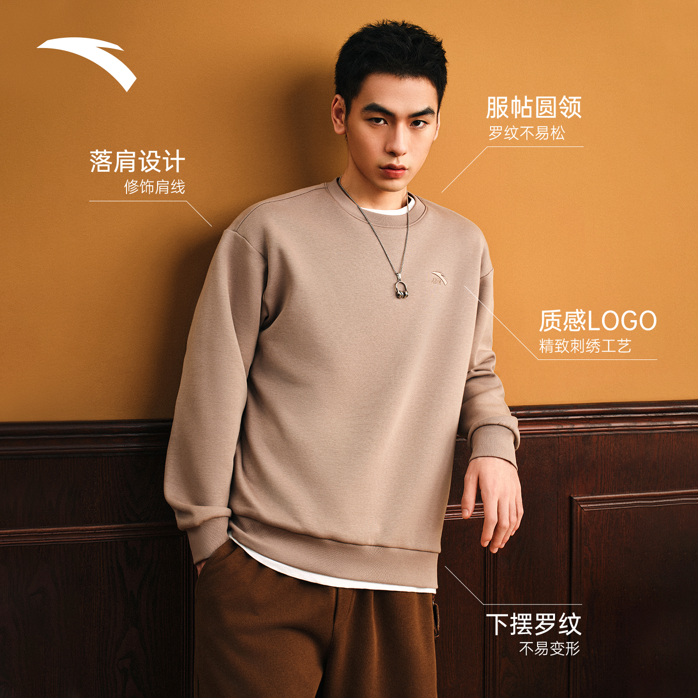 安踏加绒卫衣男保暖圆领套头衫男款2025冬季加厚宽松男士运动上衣