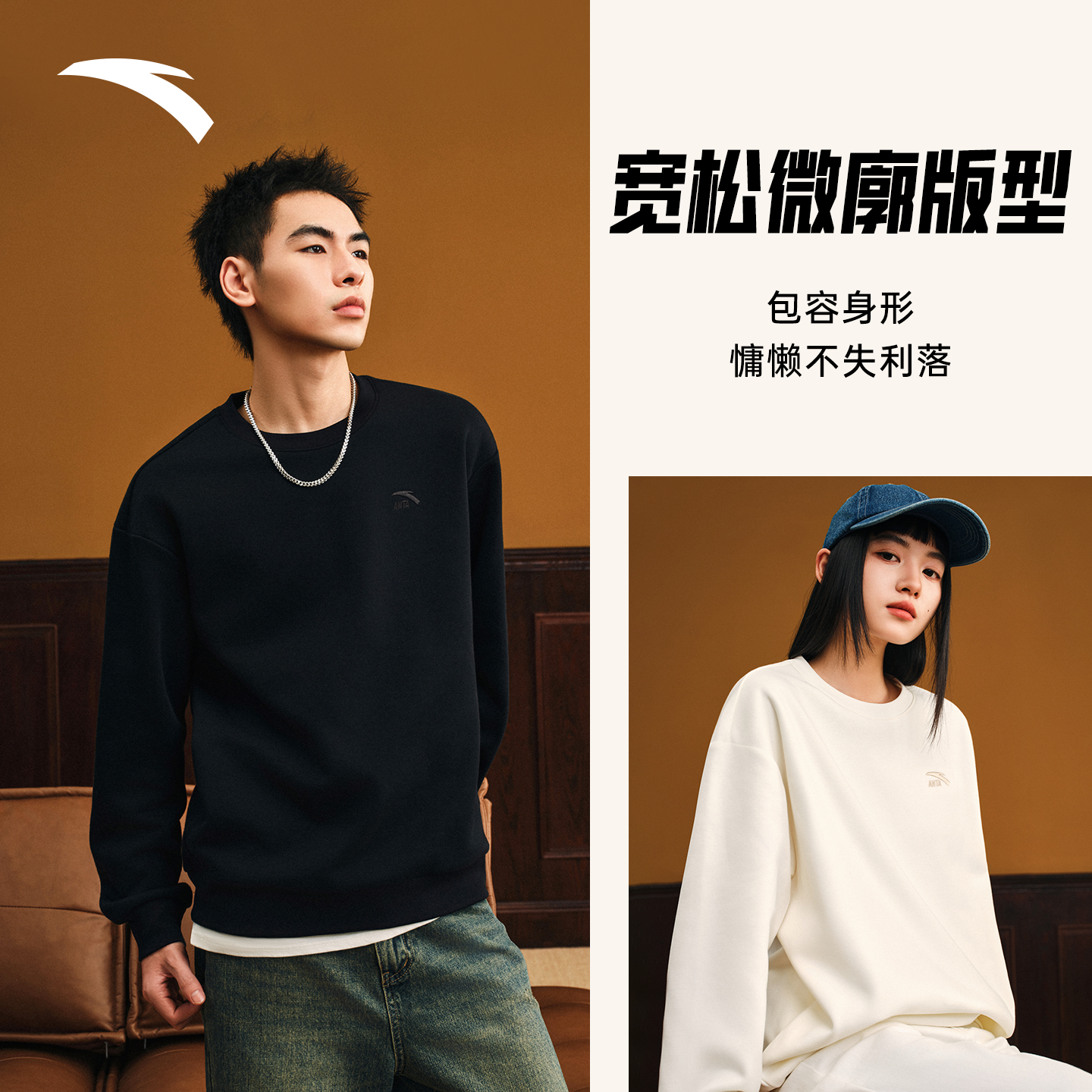 安踏休闲针织卫衣男女同款冬季新款黑色圆领加绒长袖情侣运动上衣