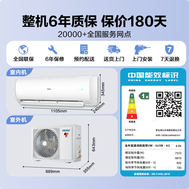 【国补8折】海尔空调1.5匹家用一级能效变频卧室挂机冷暖E1旗舰店