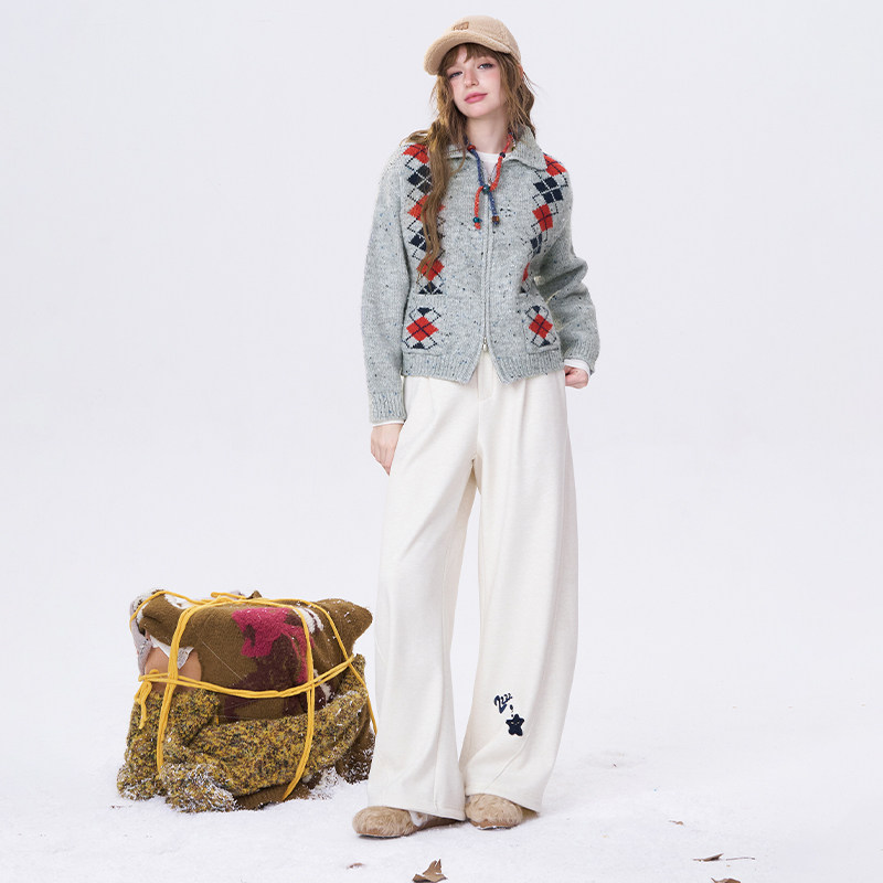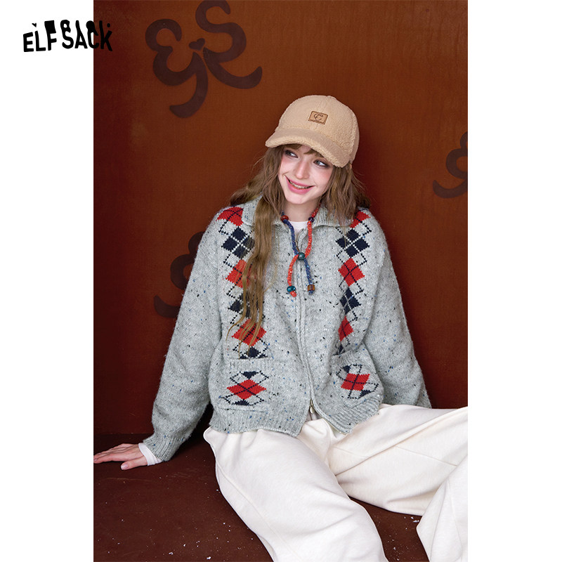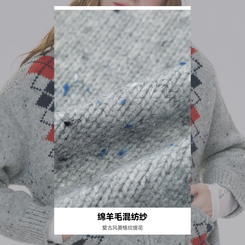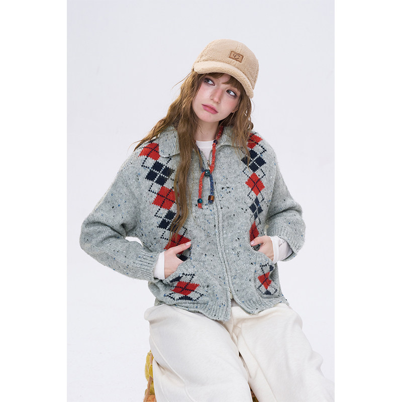 妖精的口袋复古菱格针织开衫女2026年春秋新款双拉链甜美毛衣外套