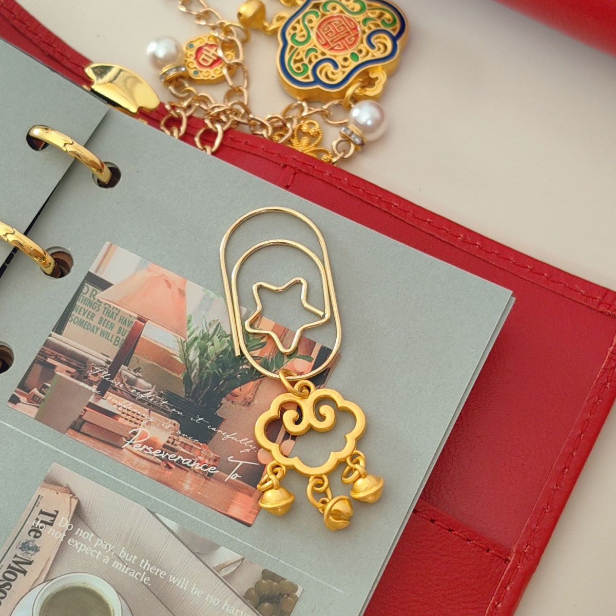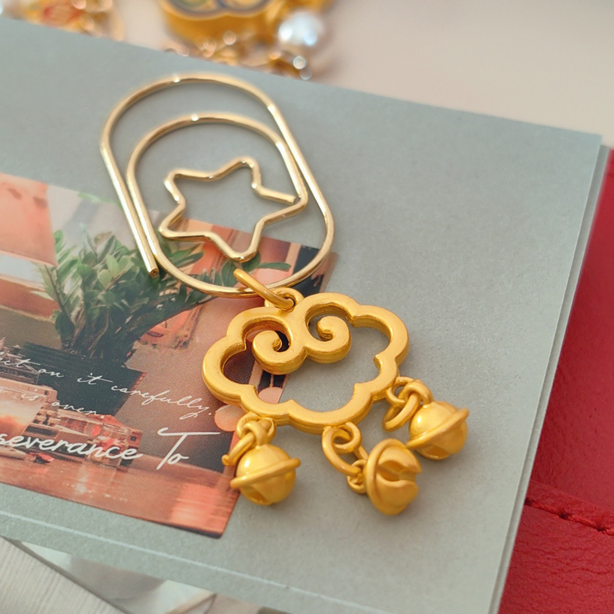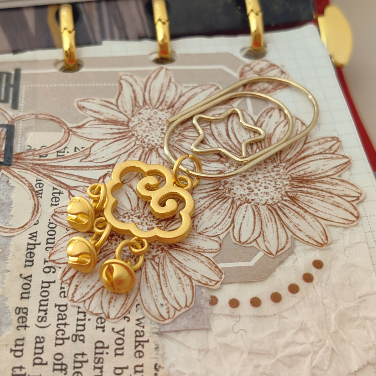 QY中国风手工沙金祥云小铃铛手帐别针装饰书签INS风欧美风活页
