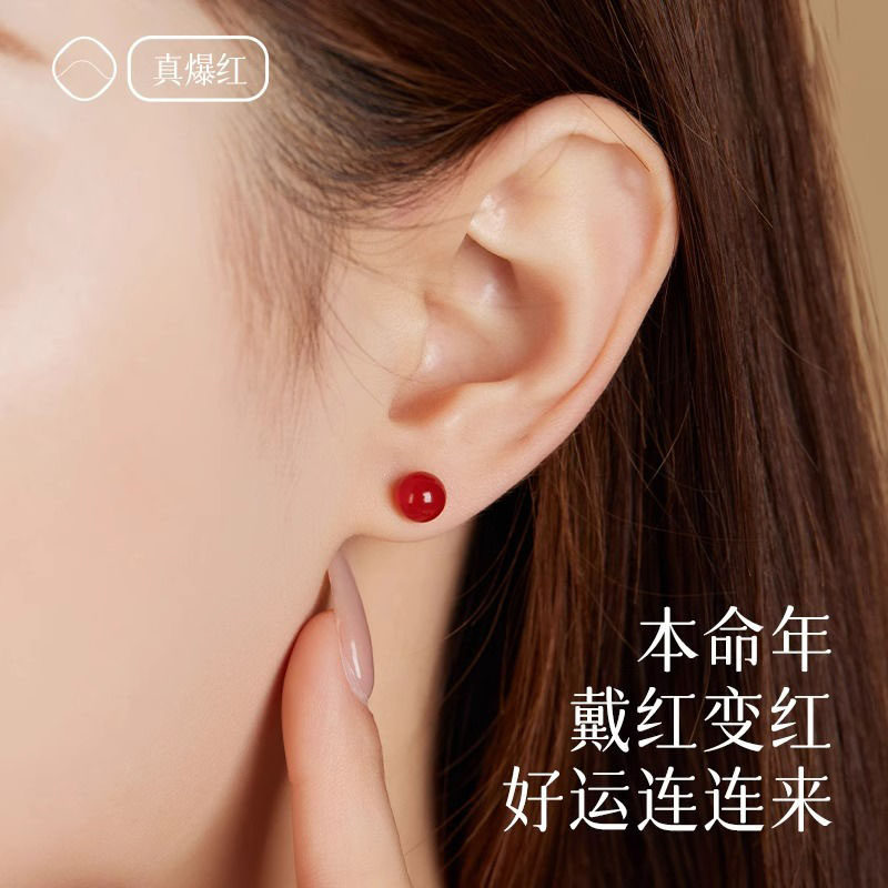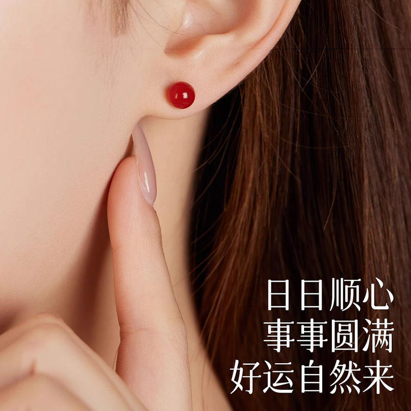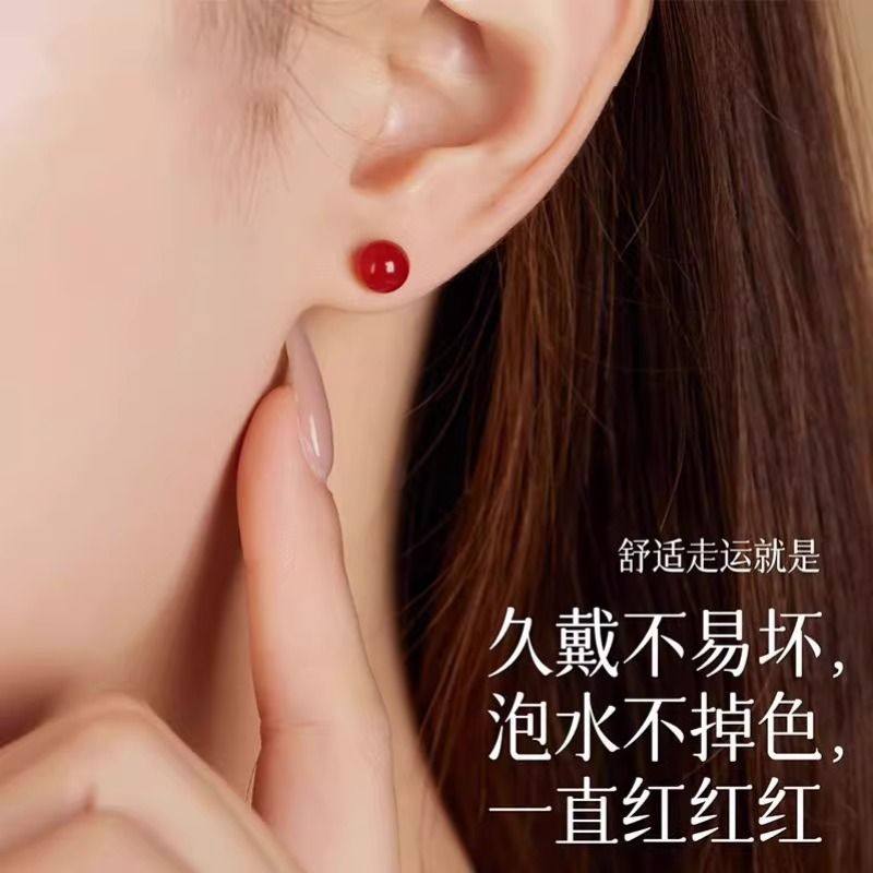 s925银针养耳洞红玛瑙耳饰女款相思豆耳钉搭配旗袍高级国风感