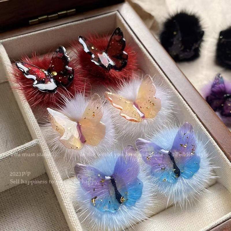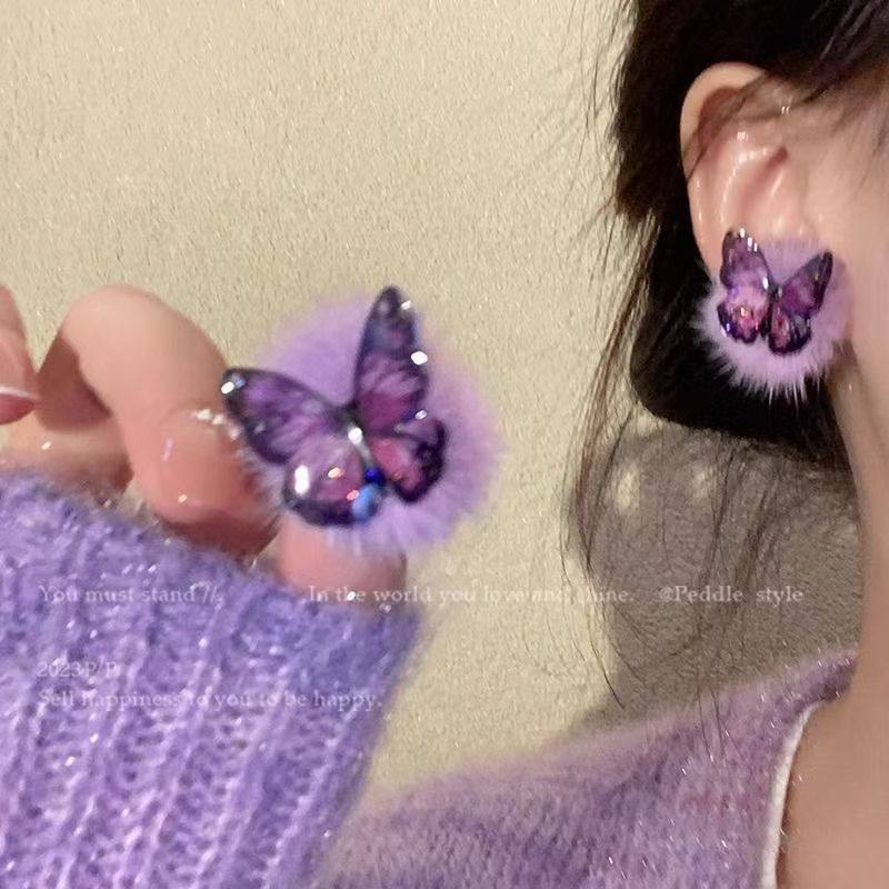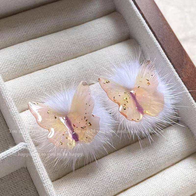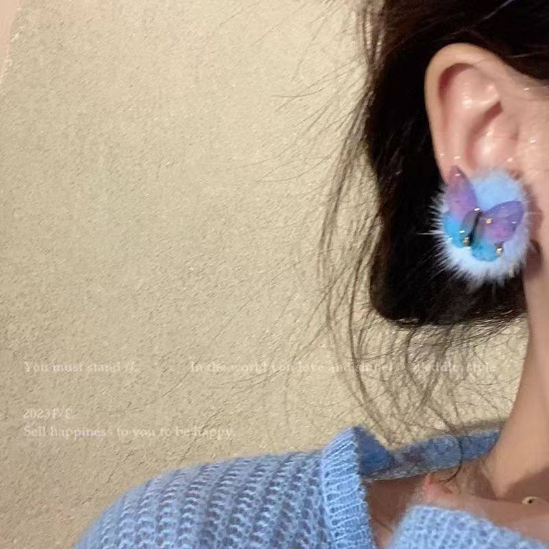 甜美可爱多彩蝴蝶毛绒耳环小众设计感独特耳钉2025新款气质耳饰女