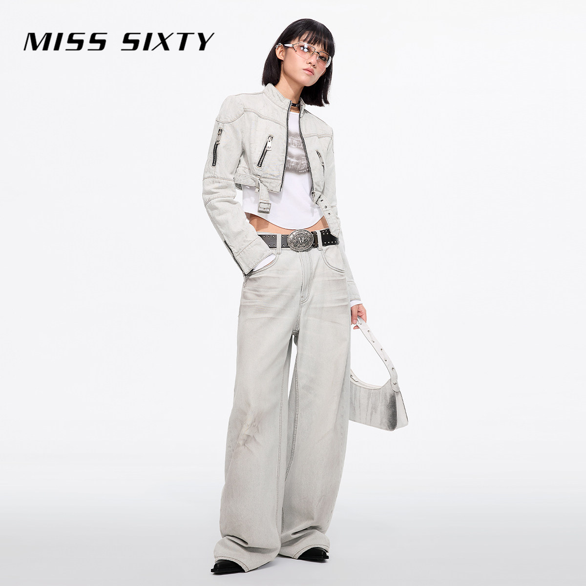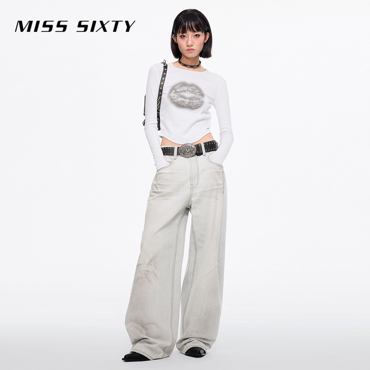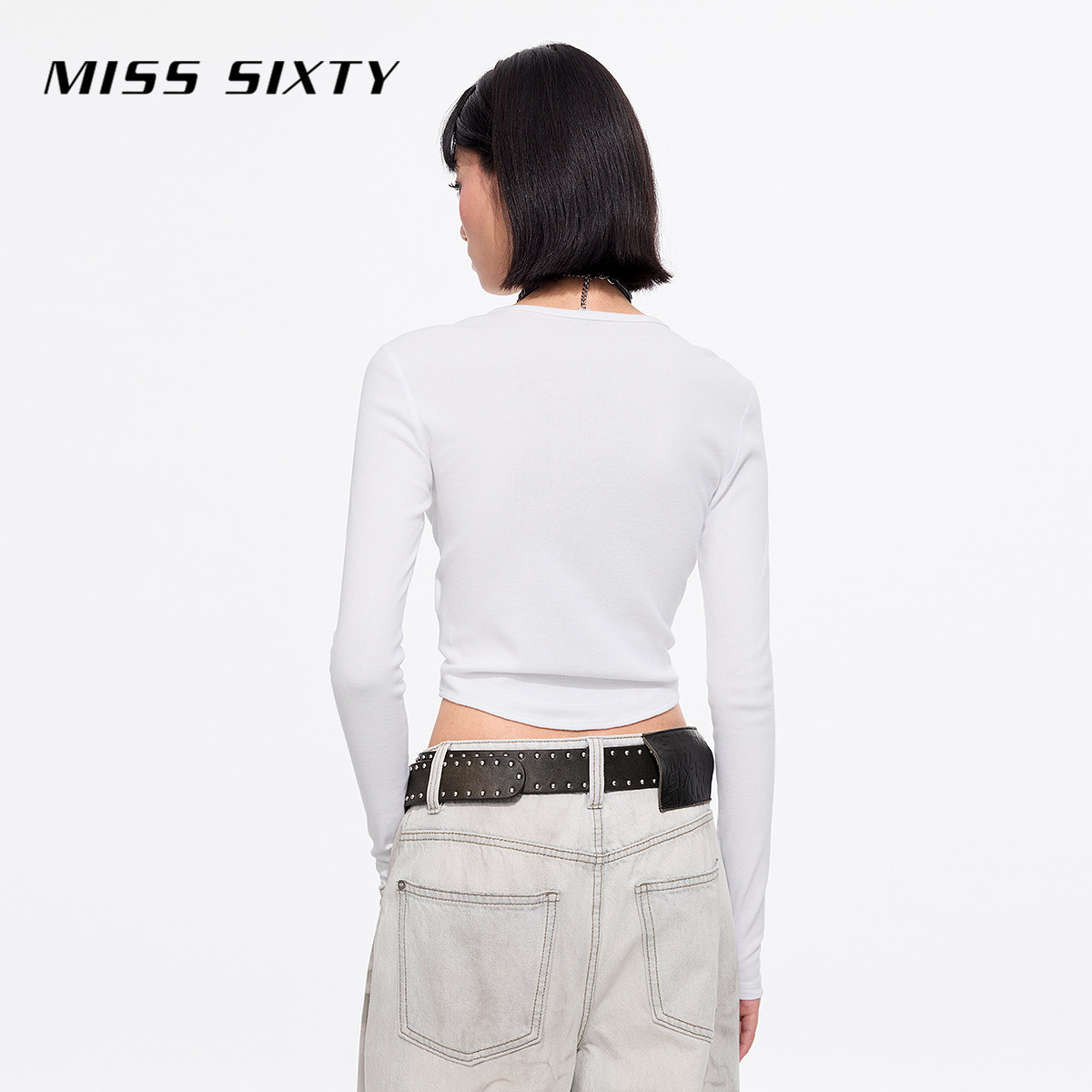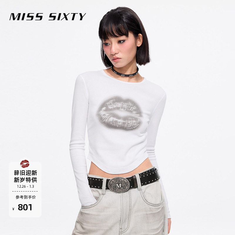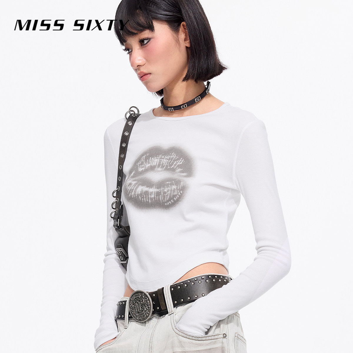 Miss Sixty2025春秋款正肩T恤女唇印修身显瘦短款白色弧形下摆