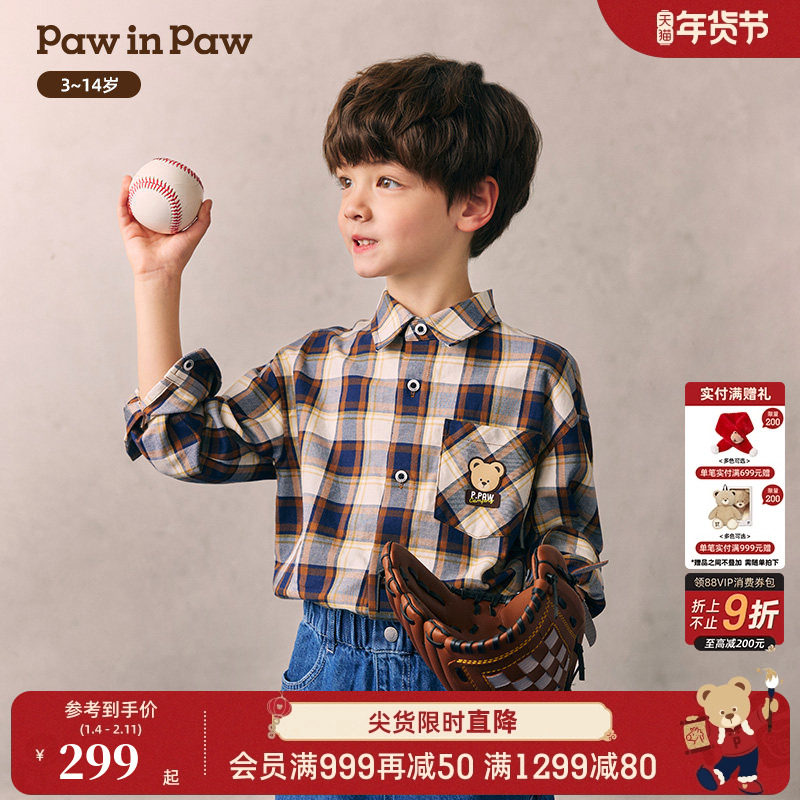 PawinPaw卡通小熊童装26年春夏季新款男童儿童翻领格纹衬衫宽松