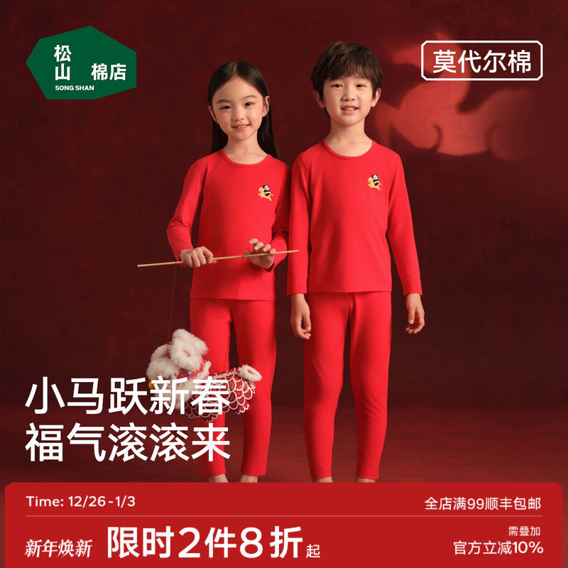 松山棉店马年鸿运棉莫儿童男抗静电套装红色女本命年加高腰秋衣裤