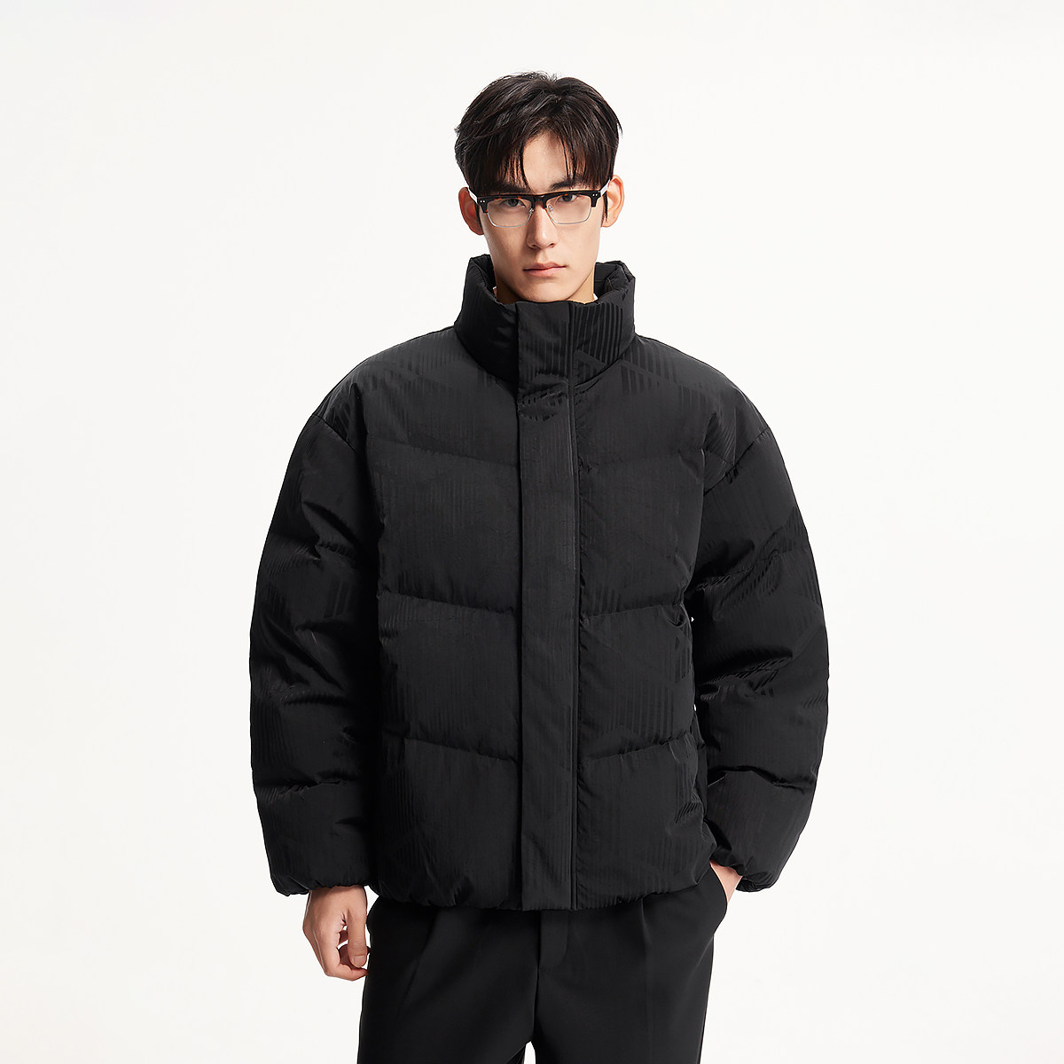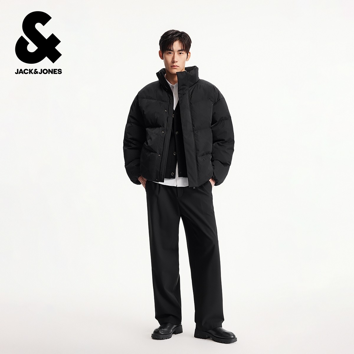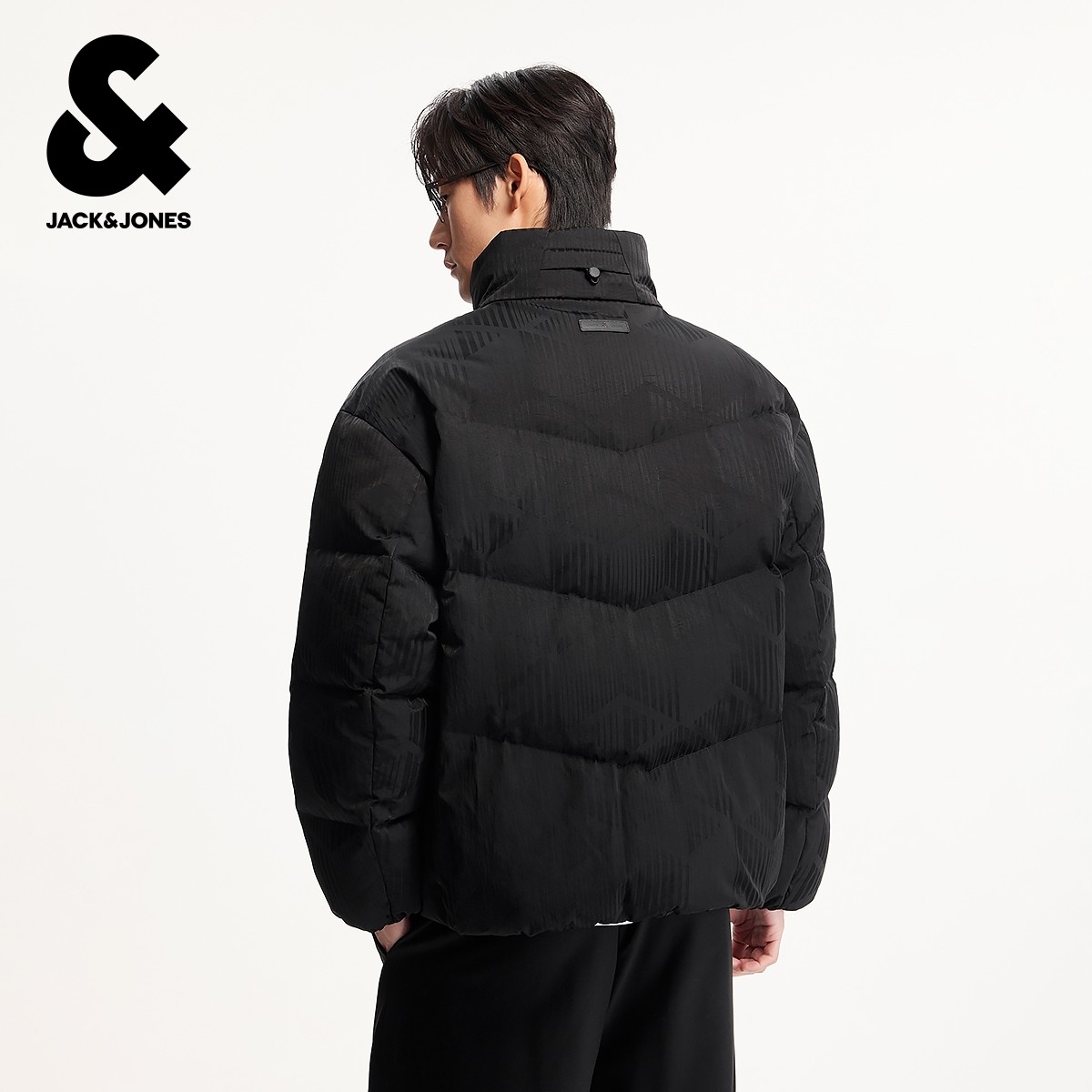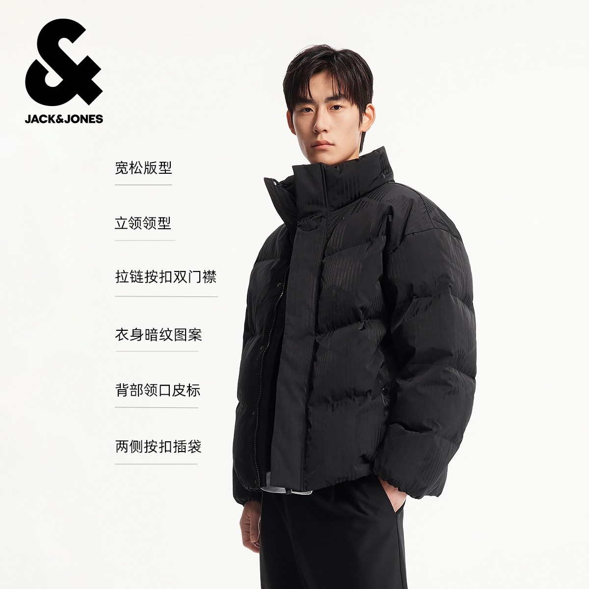 杰克琼斯男装冬季羽绒服宽松立领纯色暗纹时尚百搭简约设计感外套