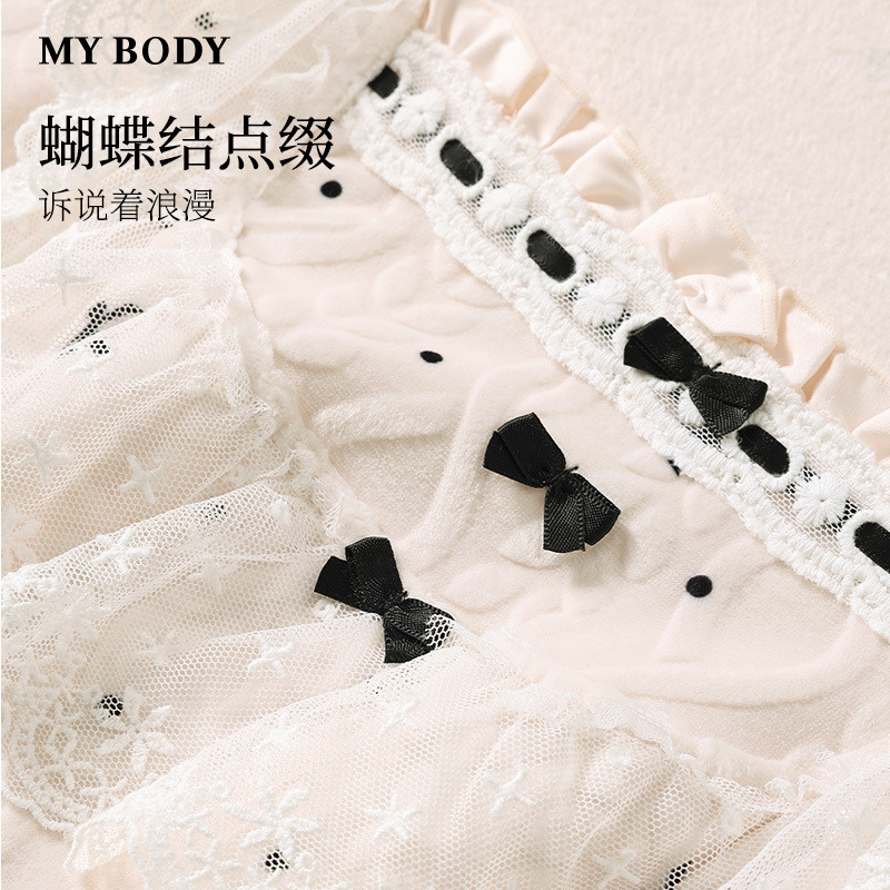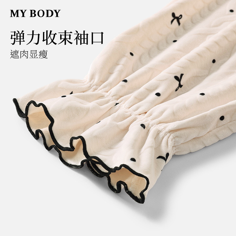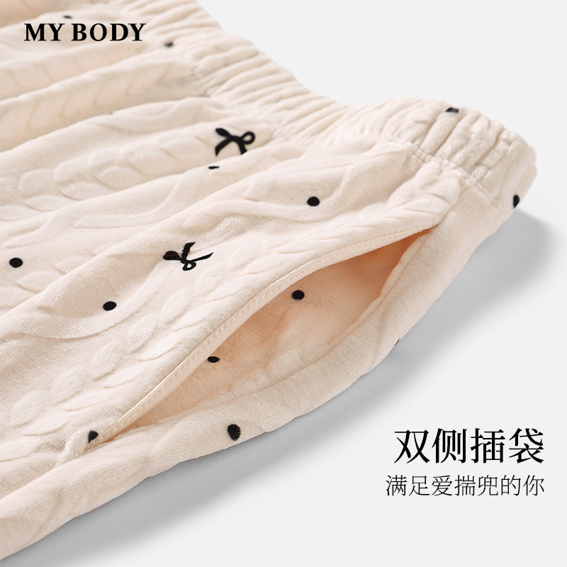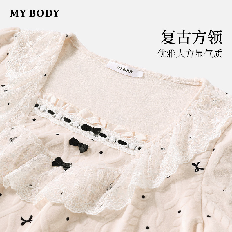 商场同款MYBODY秋季新款睡衣柔软亲肤法兰绒蝴蝶结复古方领家居服