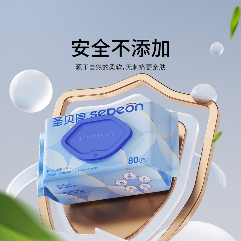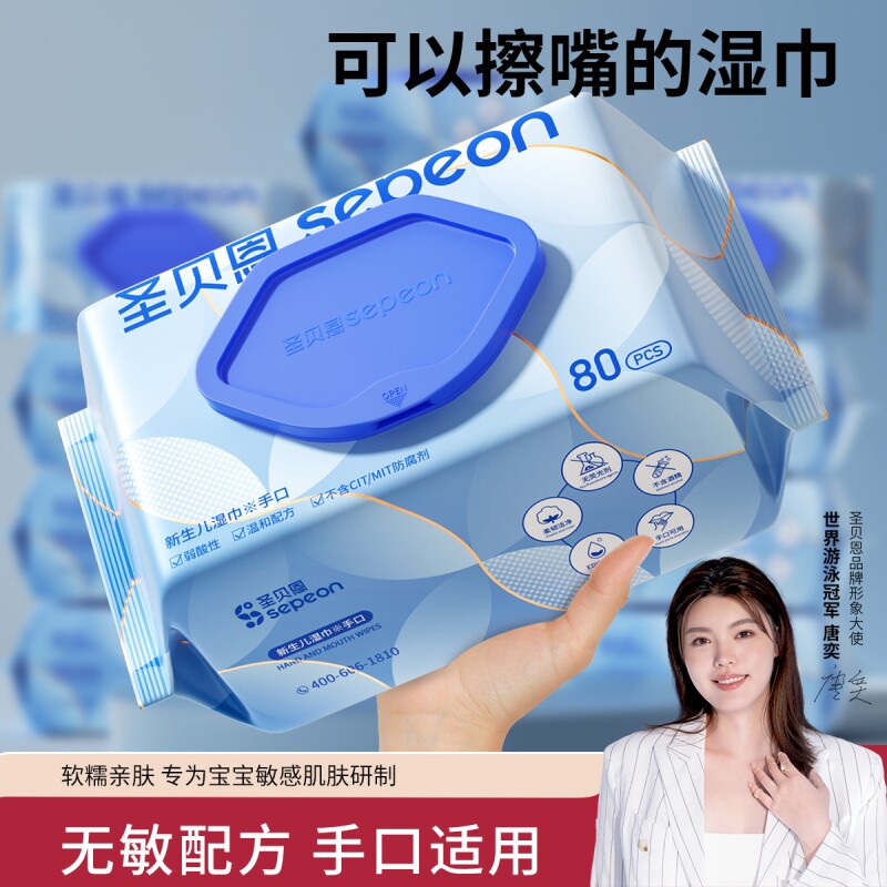 圣贝恩婴儿湿巾纸新生宝宝手口专用屁幼儿童80抽5包家庭加厚大包