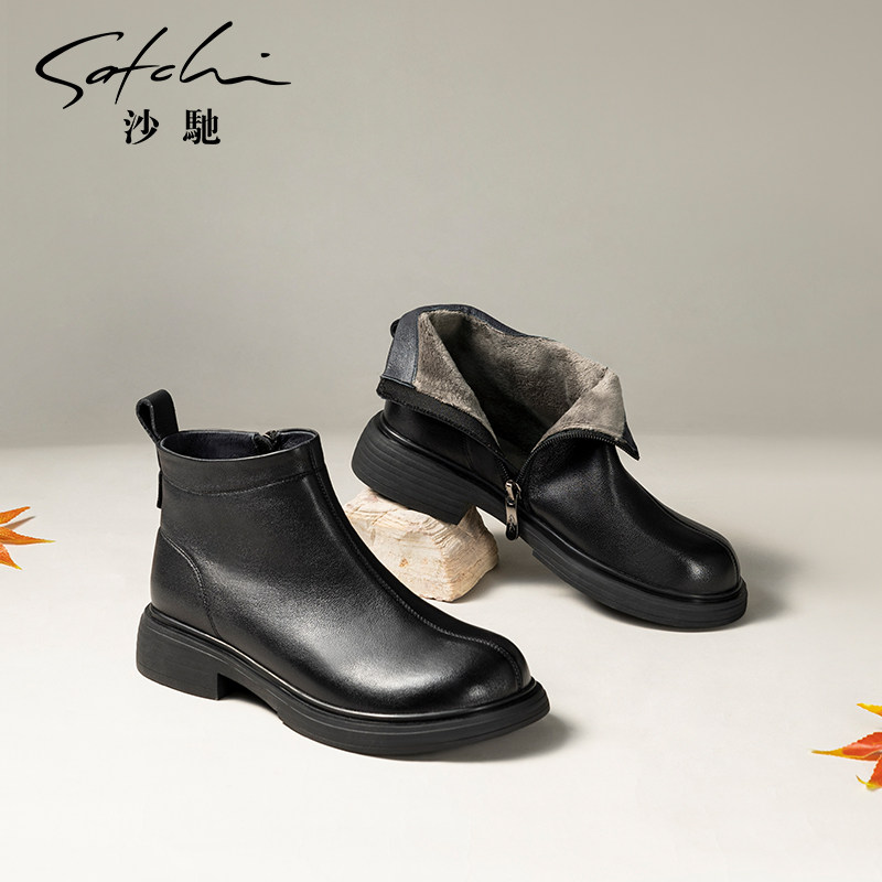 沙驰女鞋平跟羊皮革时装靴短靴2025年冬季新款通勤百搭短筒女靴子