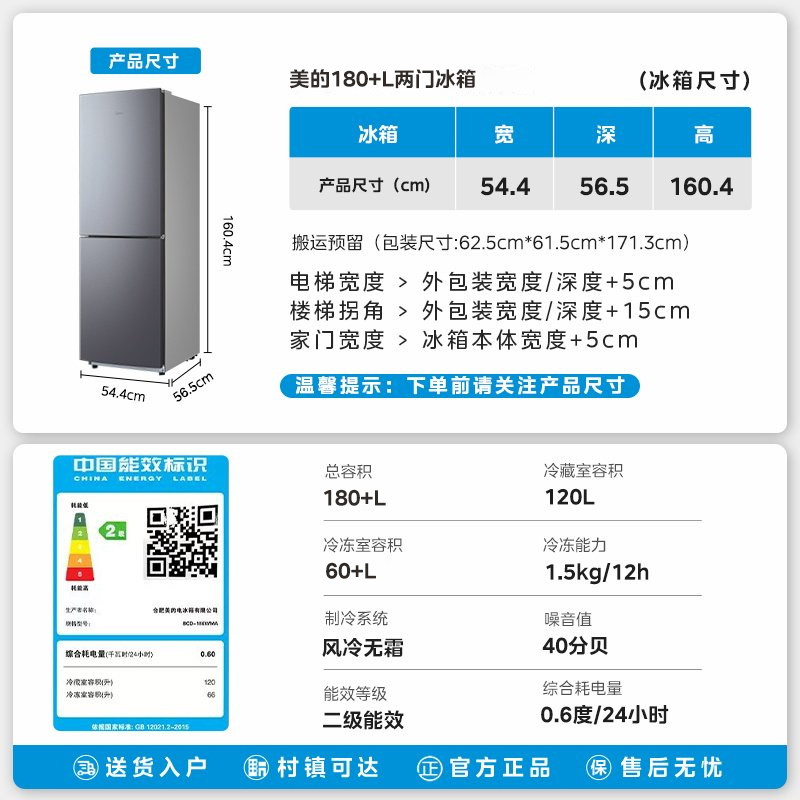 美的180+风冷无霜双门两门家用电冰箱小户型节能低噪冷藏冷冻租房