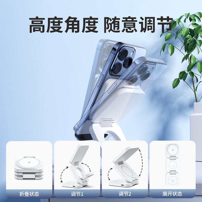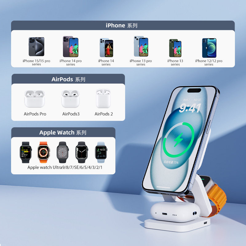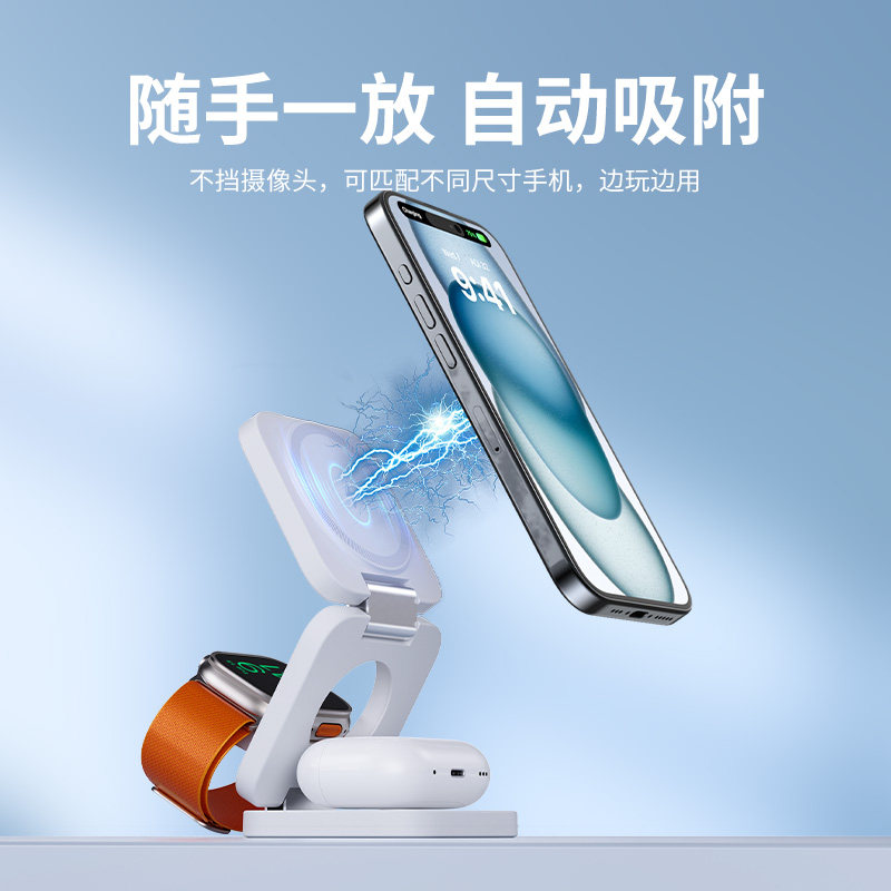 KUXIUX55三合一磁吸无线充电器适用苹果16/15ProMax手机apple watch手表充电底座快充magsafe耳机支架airpods