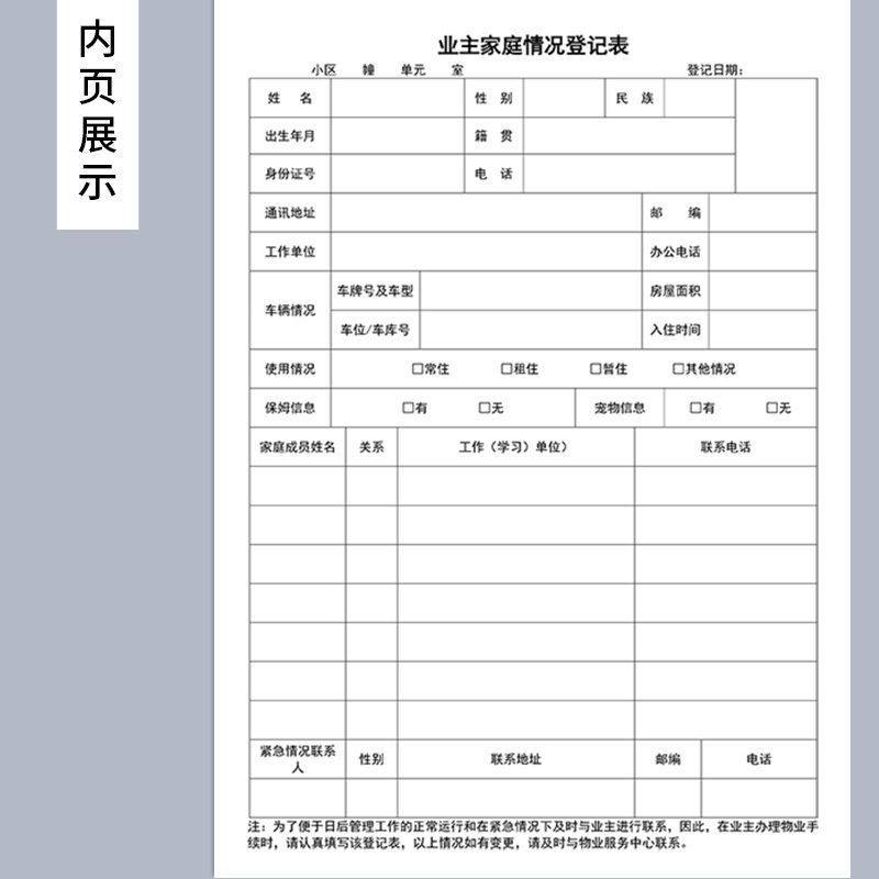 业主家庭情况登记表小区物业业主信息登记本保洁物业记录本定制