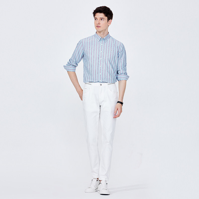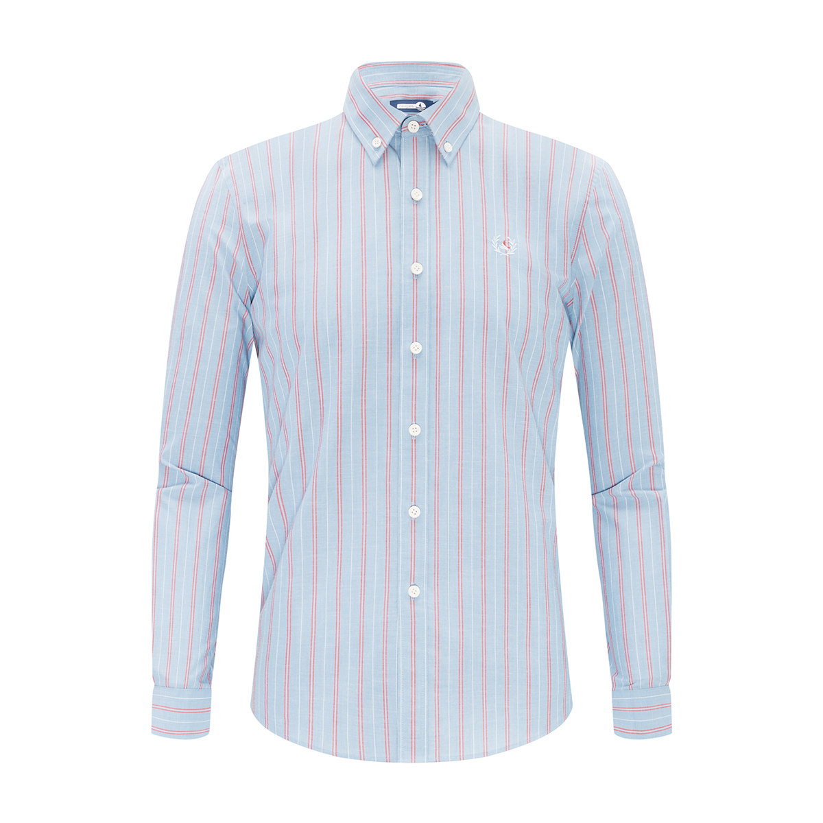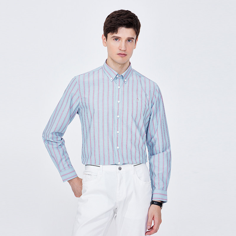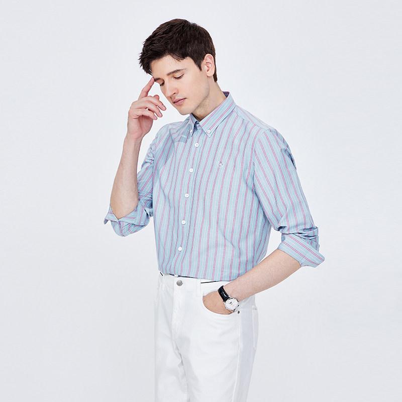 100%纯棉红豆牛津纺衬衫男长袖新款条纹休闲蓝色衬衣男士送老公