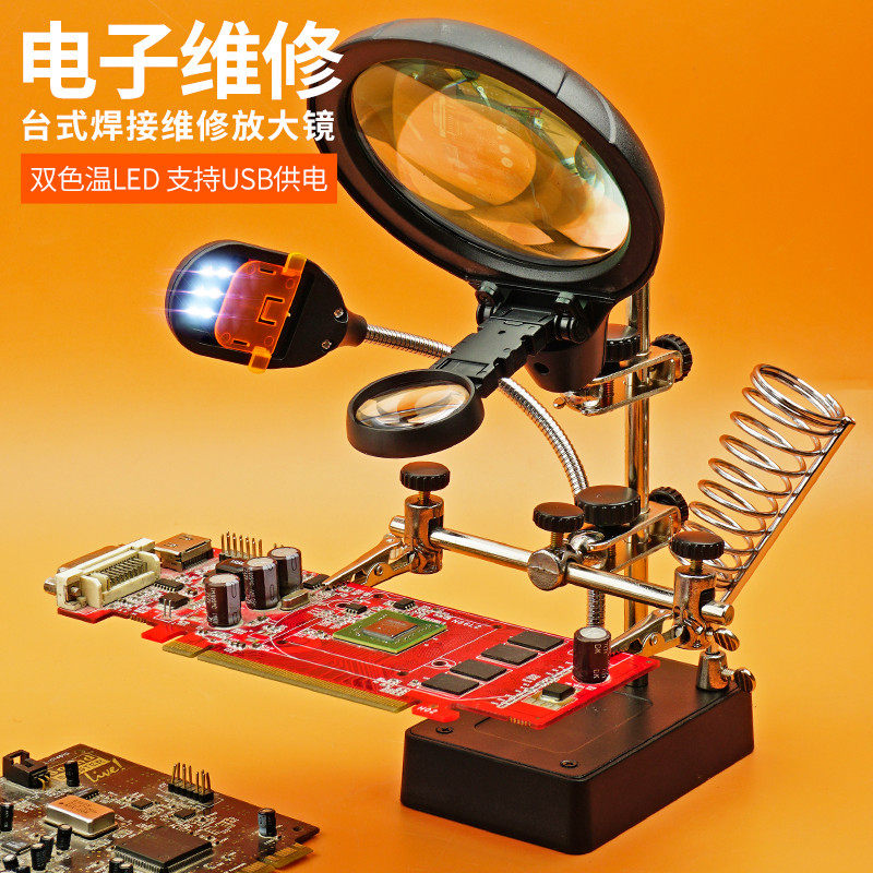 维修放大镜主板焊接夹具手机家电修理台式烙铁支架高清充电带灯
