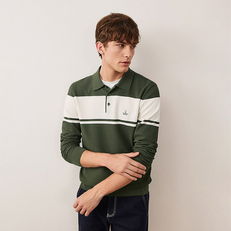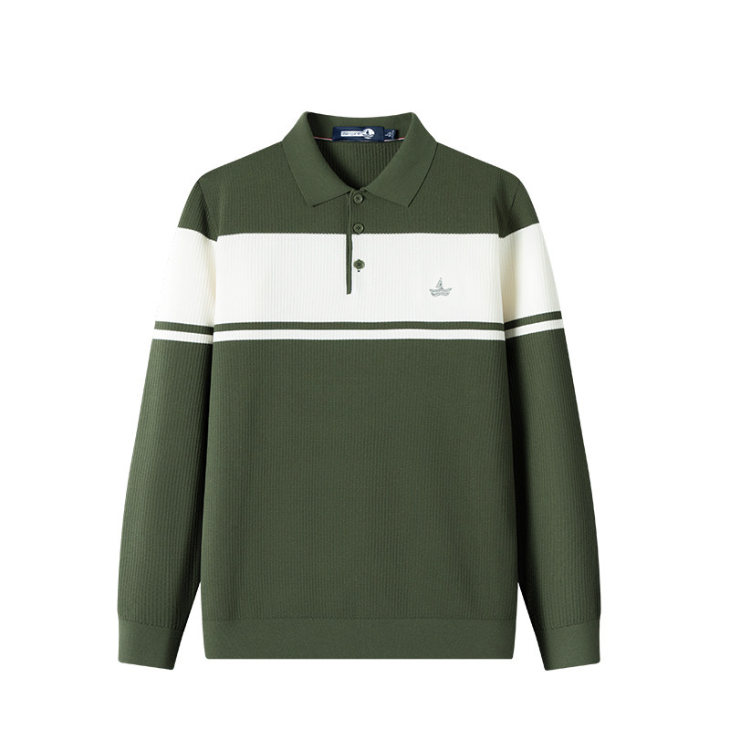 Navigare意大利小帆船秋季白色条纹针织polo衫男长袖休闲翻领T恤