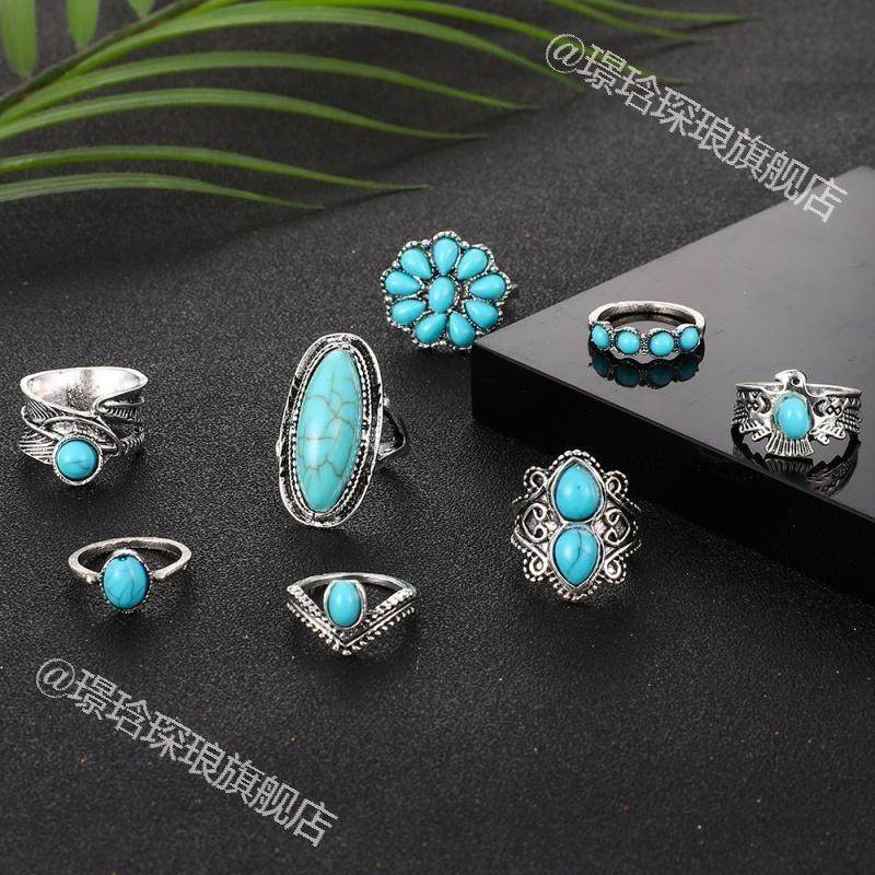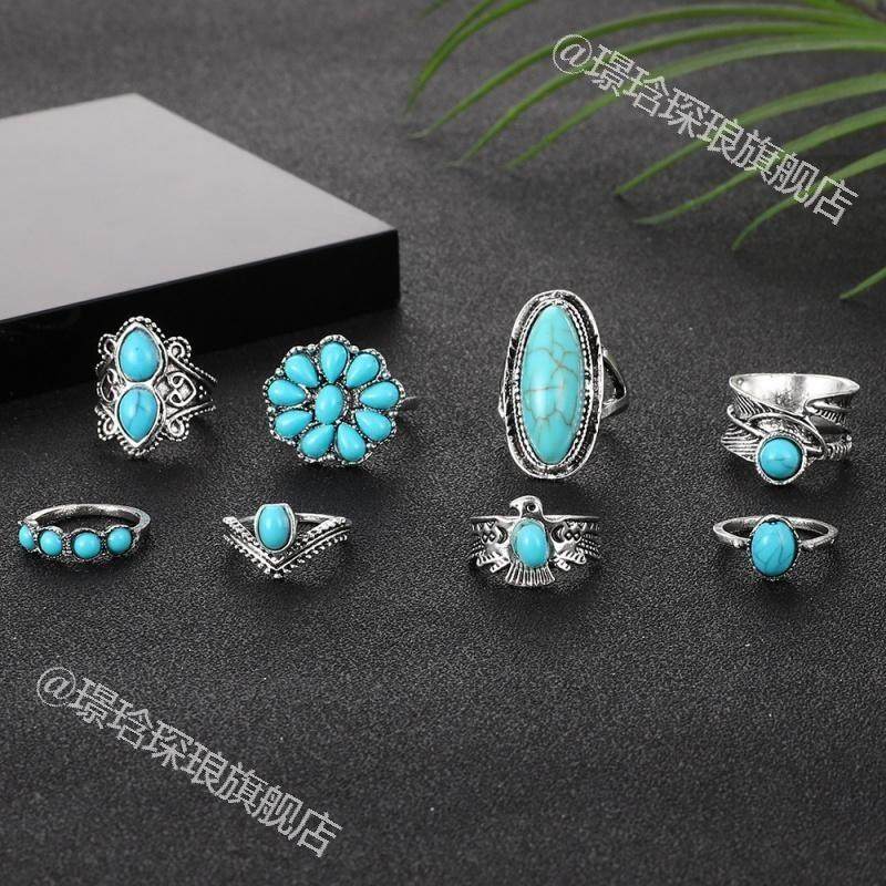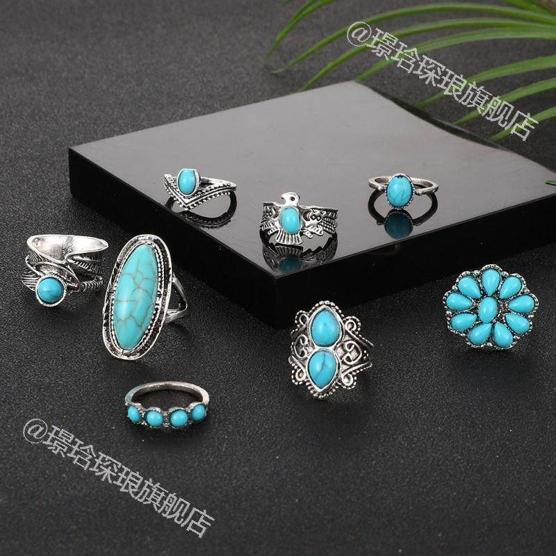 欧美新款 波西米亚风复古猫头鹰羽毛仿仿绿仿仿松石8件套装戒指