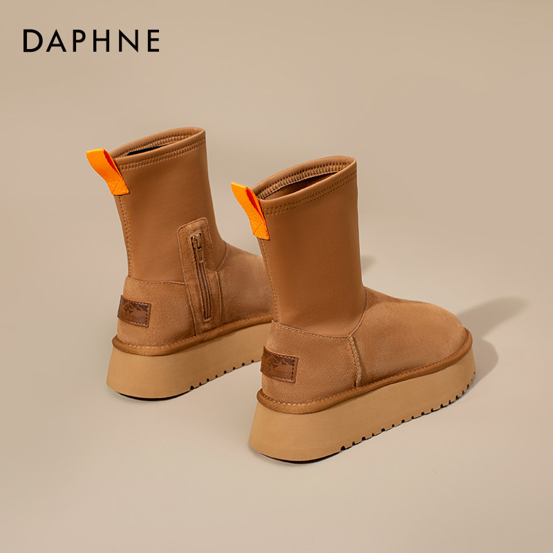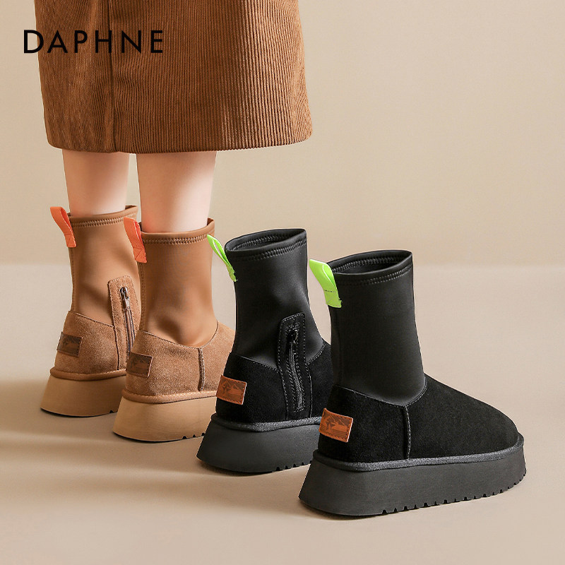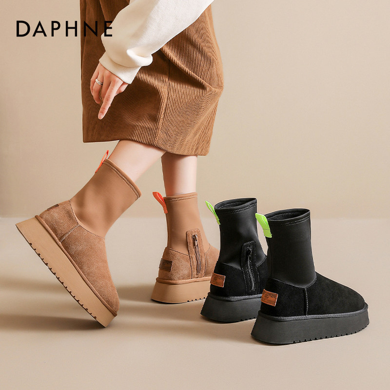 达芙妮铅笔靴雪地靴女2025新款冬季厚底加绒加厚保暖弹力袜靴棉鞋