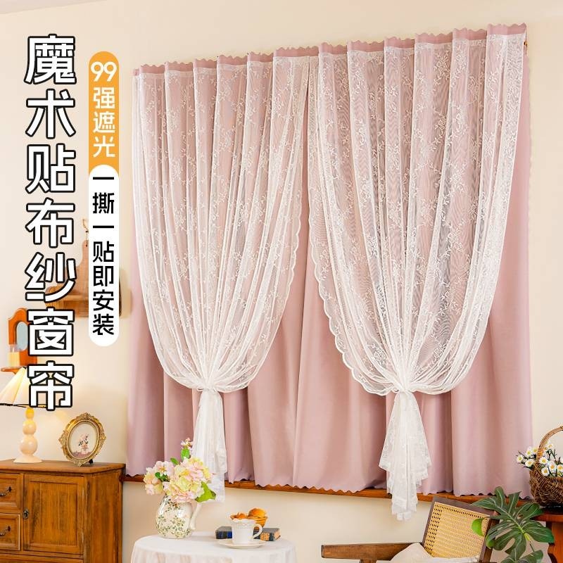 魔术贴纱帘法式简易窗帘公主风高遮光帘子免打孔安装全遮光卧室