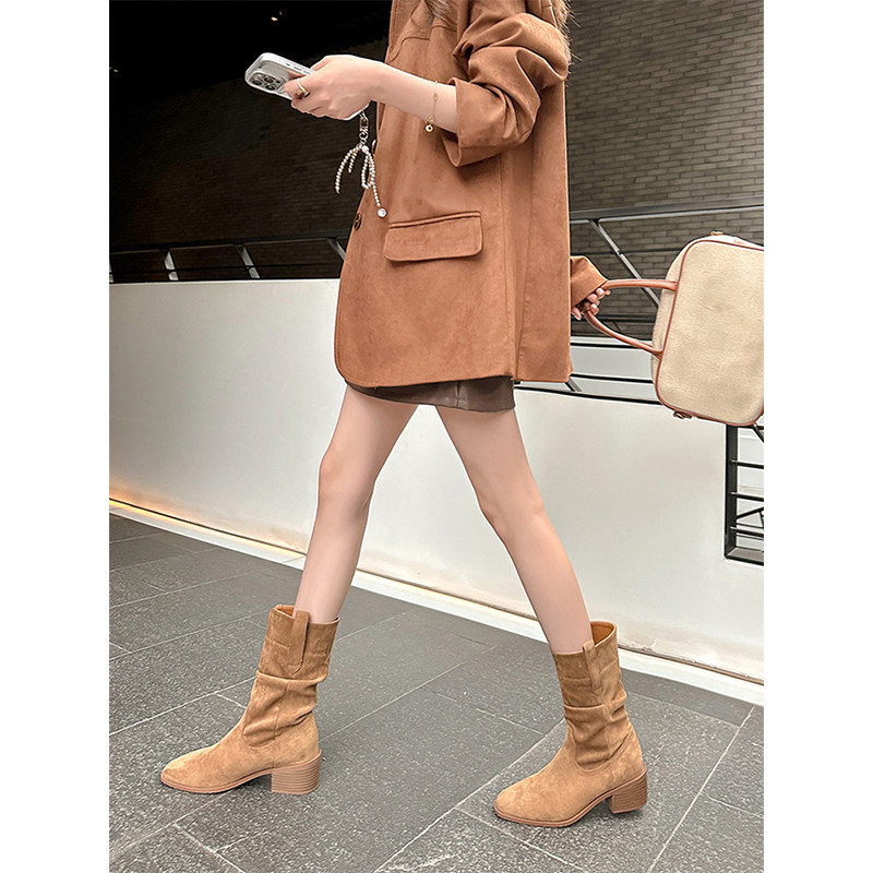 羊皮版~内增高靴子女2025新款爆款中筒粗跟短靴卡其色褶皱堆堆靴