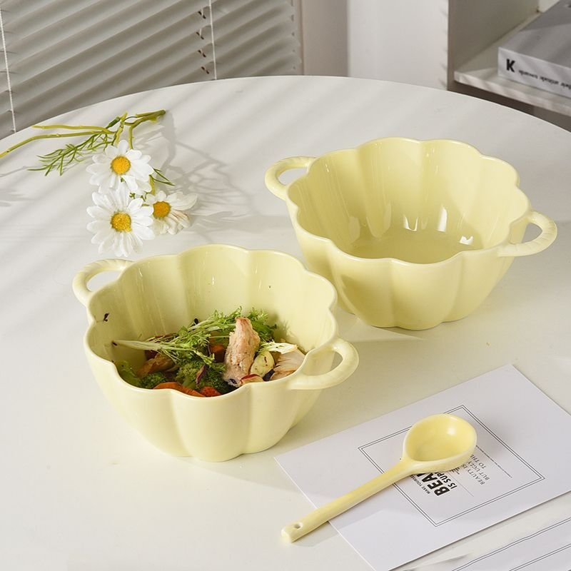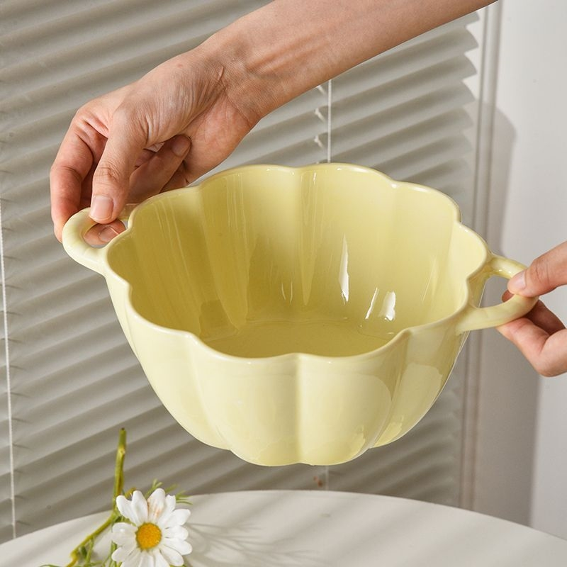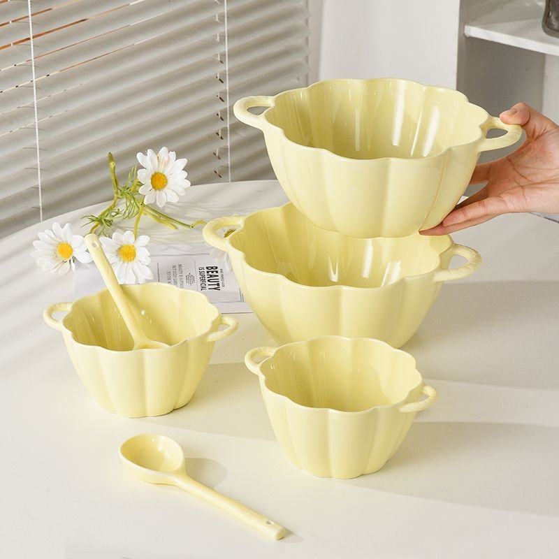 高颜值奶黄色双耳大汤碗带勺ins风陶瓷家用碗可爱南瓜碗餐具套装