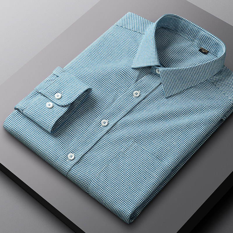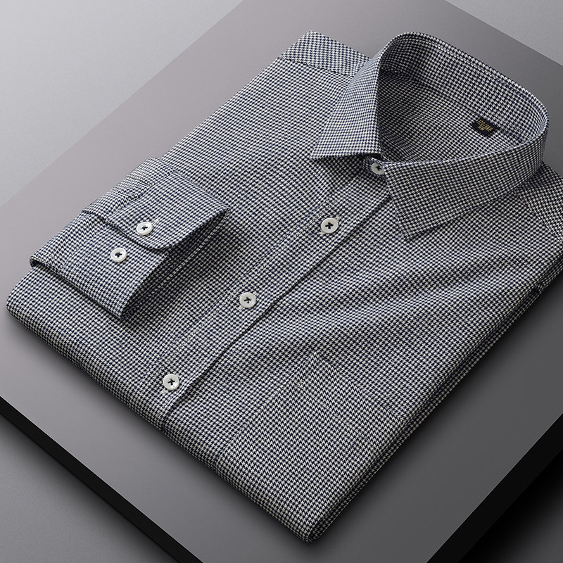 啄木鸟春秋季男士长袖纯棉磨毛细小千鸟格衬衫中年商务休闲灰衬衣