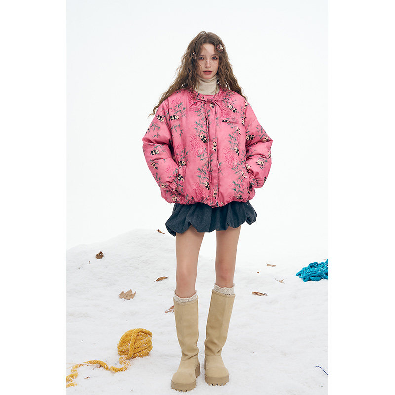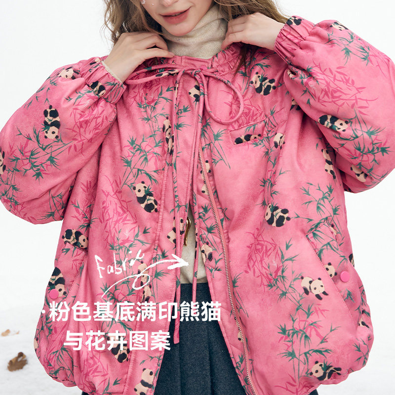 妖精的口袋新中式熊猫满印短款羽绒服女2025冬新款复古国风外套