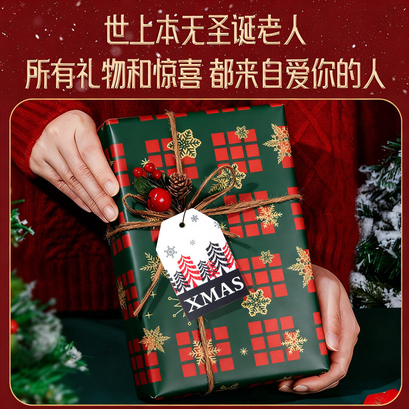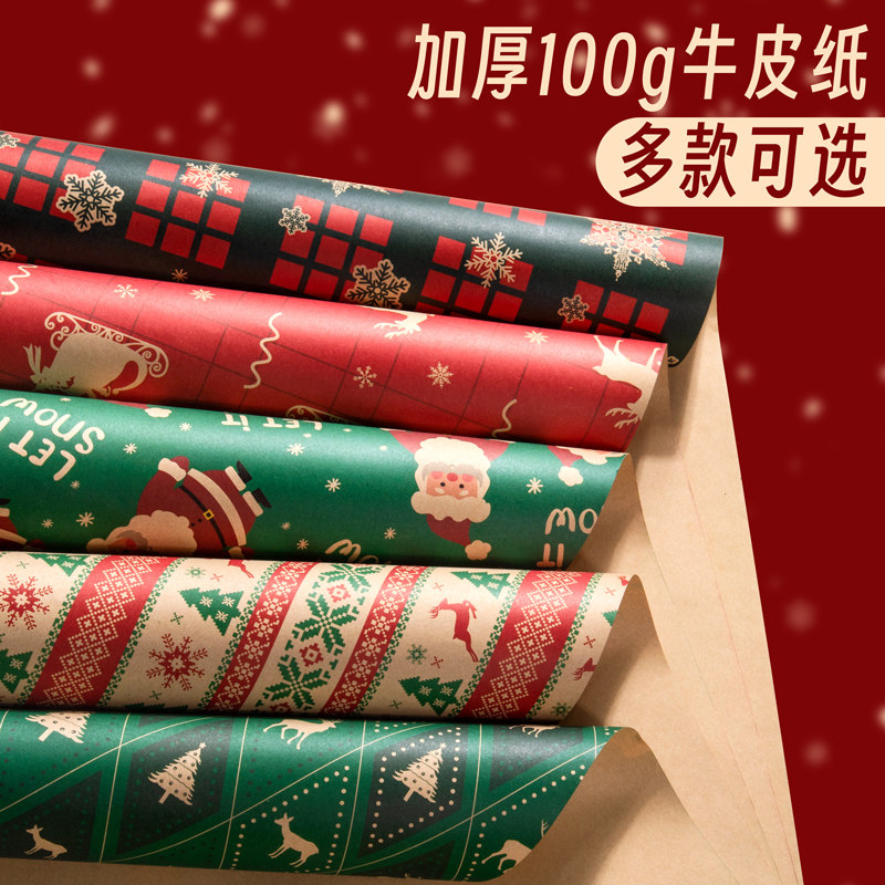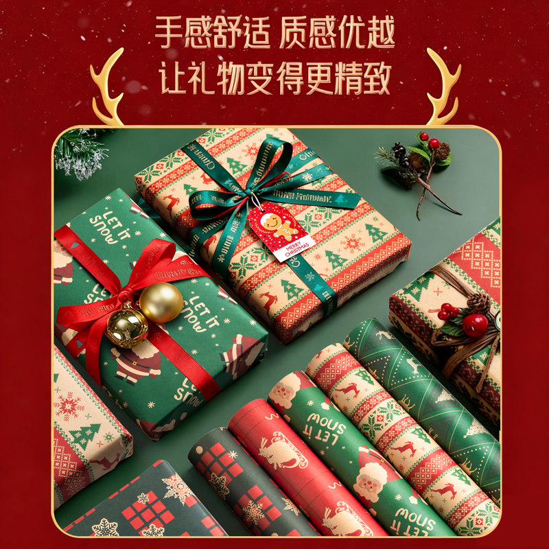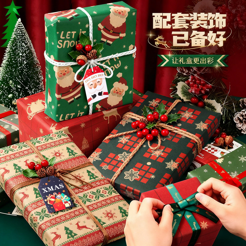 圣诞节礼物包装纸礼品纸牛皮纸加丝带儿童红色打包复古绿红高颜值
